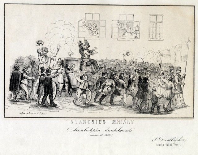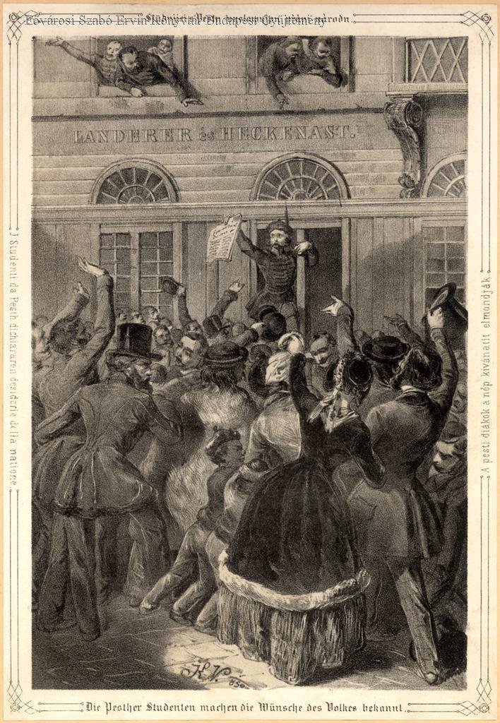 Az 1848. március 15-i események mai szemmel nézve meglepően békésen zajlottak, korántsem úgy, ahogyan a „forradalom” szó hallatán elsőre gondolnánk, nem volt vérontás, mint más európai városokban. A forradalmi ifjúság tagjai, Petőfiék vezetésével, miután felolvasták a Nemzeti dalt a Pilvaxban, majd a lelkes egyetemi polgársággal kiegészülve kinyomtatták azt a 12 ponttal együtt, egyszerűen hazamentek ebédelni azzal az ígérettel: 3-kor találkoznak a Nemzeti Múzeum előtt.