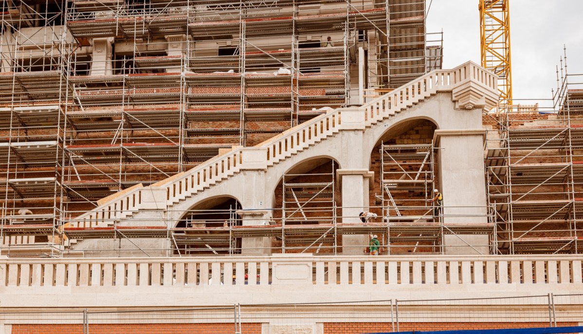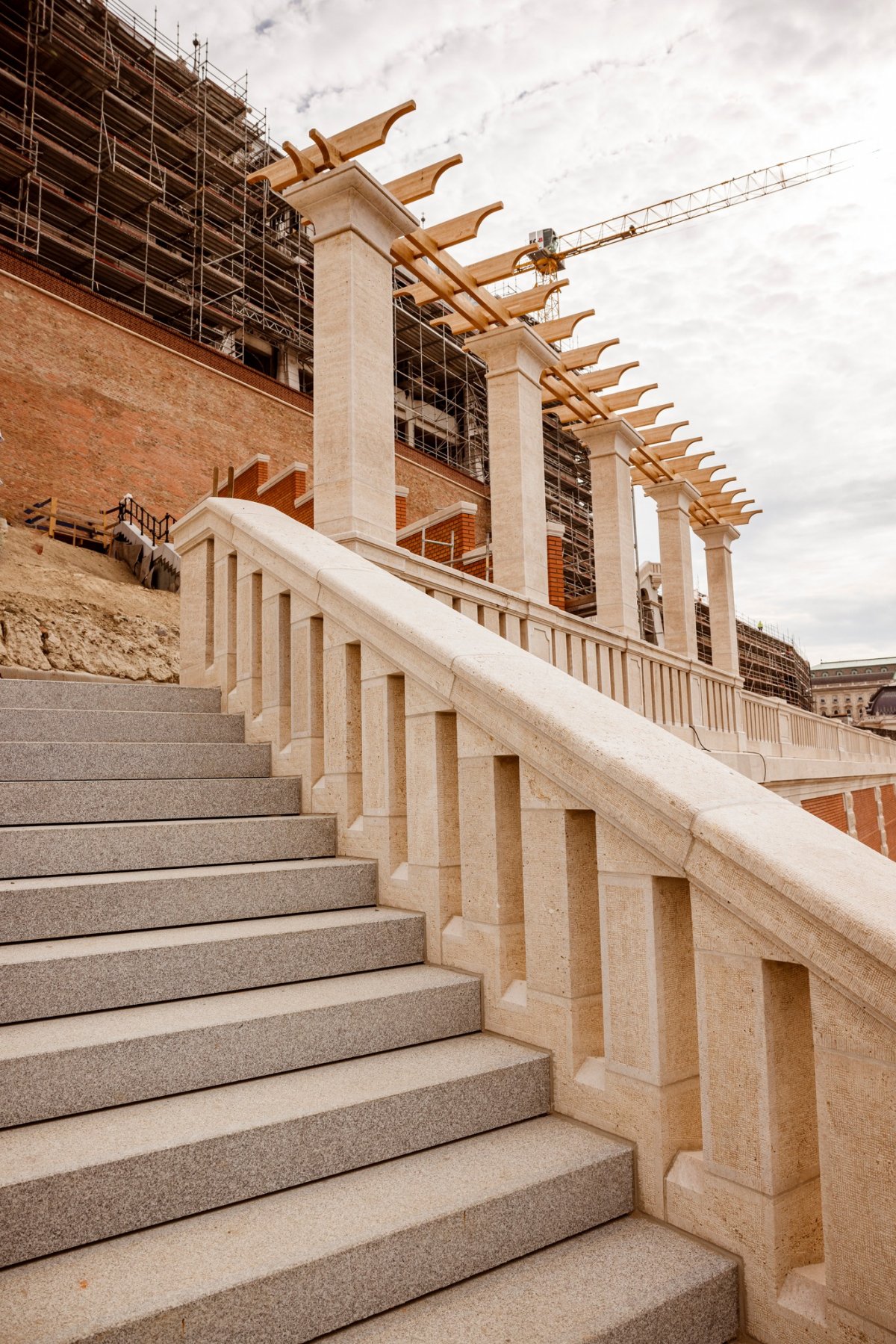 A lépcsőt korabeli fotók figyelembevételével építik újjá (Fotó: Nemzeti Hauszmann Program)