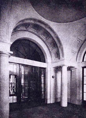 A stílust viszonylag kevés dísz használata jellemzi, de az első emeleti ablakok azért szép szemöldökpárkányokat kaptak: a szélsők fölött timpanon látható, a középső hármat pedig egy félköríves lunetta köti össze, mi által az úgynevezett Palladio-motívum jön létre. Ehhez tartozik még a két szélső ablak fölé helyezett kör alakú koszorú is. A lunettában szárnyas oroszlán domborművek láthatók, a félköríves bejárat ívmezőjében pedig koszorút tartó angyalok. Palladio-motívumot találunk még a Nádor utcai oldalhomlokzat szélein is, de csak az első emeleten, mivel építésekor az volt a középső szint.
