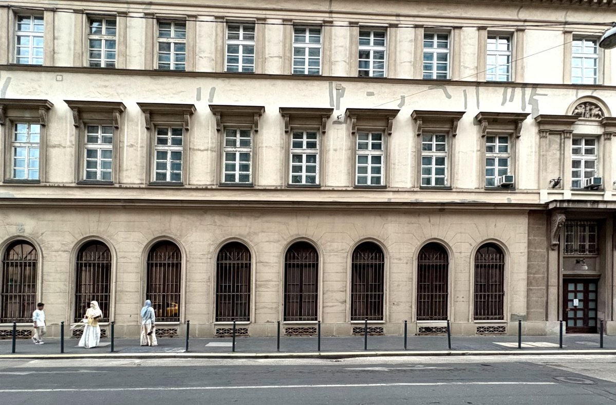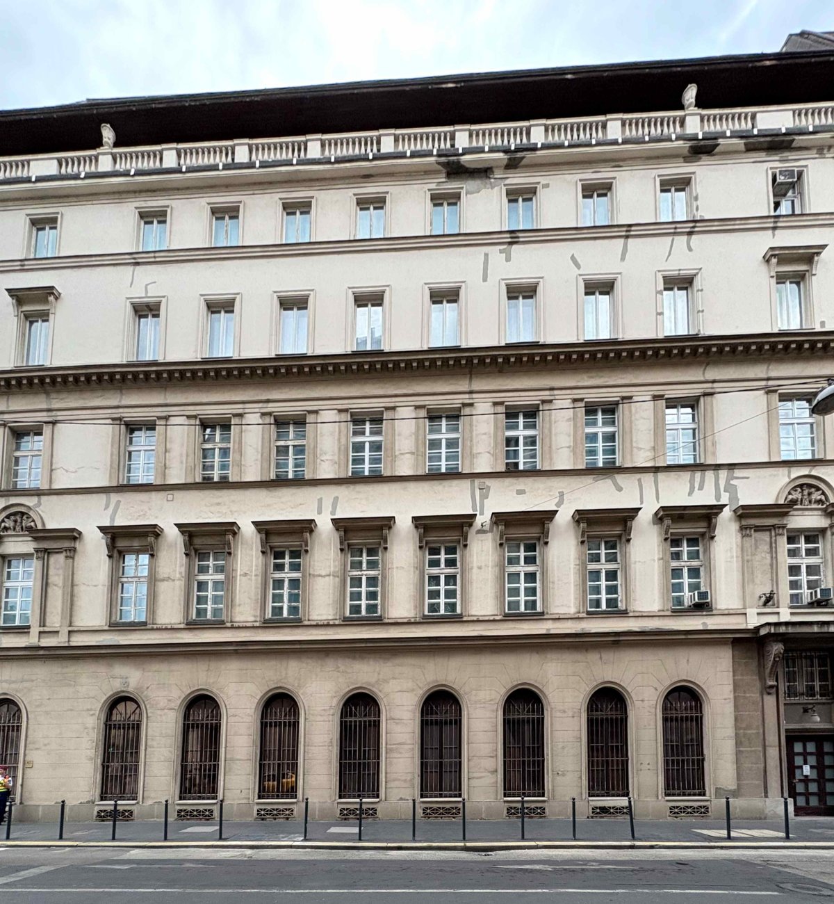 A földszinti ablakok szintén félköríves záródásúak, az első és a második emeleten viszont vízszintes lezárású nyílások sorakoznak. Ritmusuk azonban a túlzott ridegség elkerülése végett nem egyenletes, a középtengelyben összesűrűsödnek, így rímelve a bejárat szélesebb keretére. A szinteket határozott párkány választja el egymástól, a koronapárkány pedig még annál is erősebben előre nyúlik. A horizontális hangsúlyt – ami egyébként szintén a klasszicizmus egyik jellemzője – Pollack azzal ellenpontozta, hogy a széleken két-két korinthoszi fejezetű falpillérrel kötötte össze az első és a második emeletet.