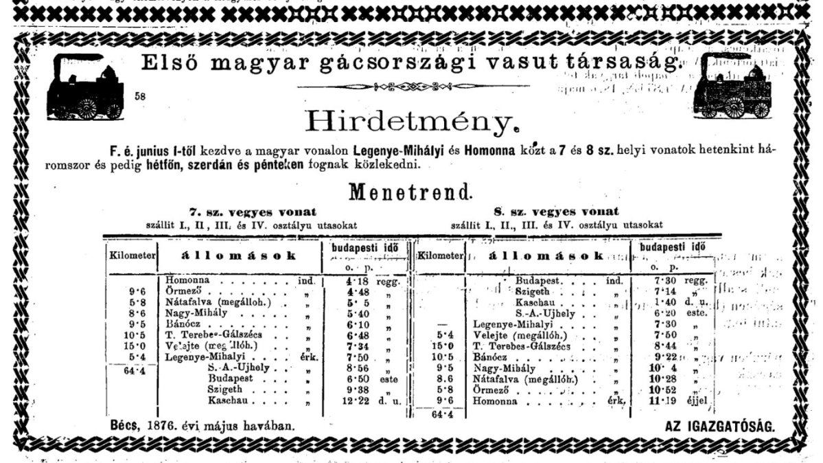 „Cs. k. szab. déli vasút. (Hirdetmény.) A magas kormány engedélyezése folytán i. é. május 16-étól kezdve a menetrendek többé nem a helyi-, hanem a pályaidő szerint fognak közzétenni. A pályaidő valamenyi osztrák területen fekvő vonalakra nézve a Prágán átmenő délövnek megfelelő prágai, a magyar korona területén levő vonalokra nézve pedig a budapesti délövnek megfelelő budapesti idő. Az átmenet a prágai időből a budapestibe Szombathely, Csáktornya és Zágráb állomásainkon történik. A prágai idő a budapestihez képest 18, a bécsihez képest 8 perccel késik. Bécsben 1876 ápril havában.”