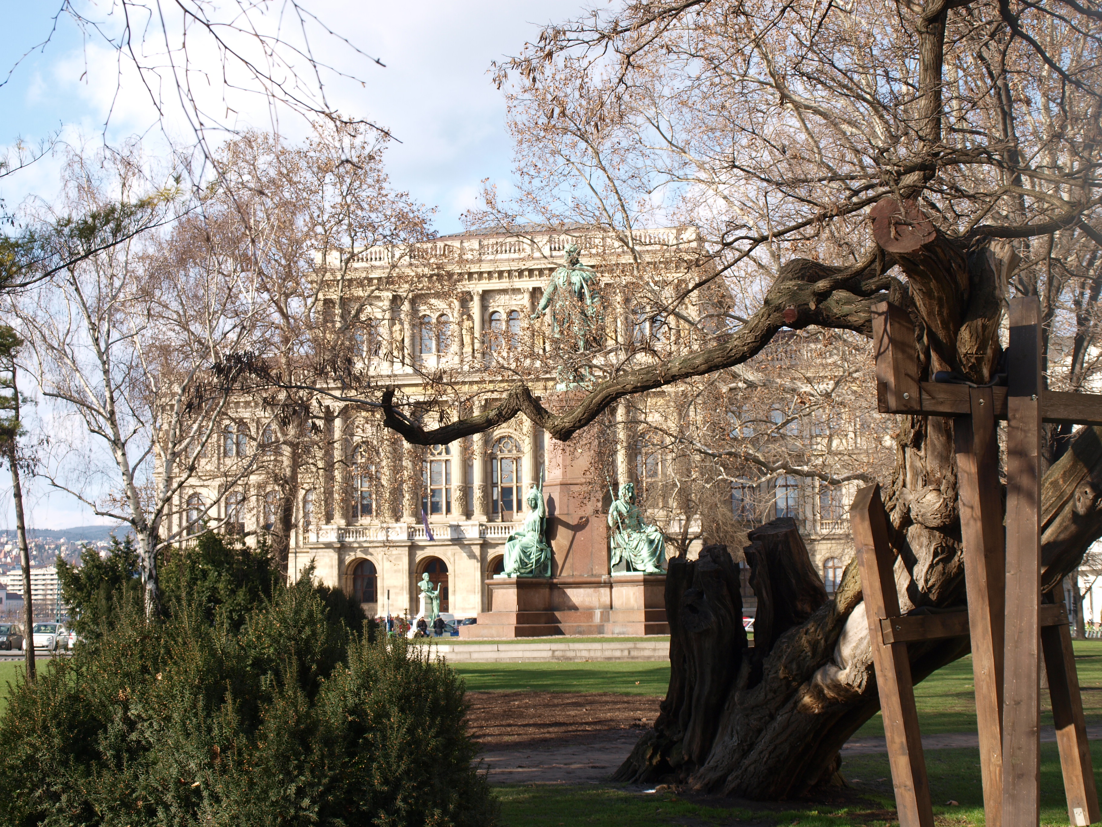 Milyen szép volna így! De azért gyanút fogtam, hogy talán mégse… Azt hiszem, nincs még egy fa, amelynek a helyzete ennyire jól dokumentált volna, hiszen a környező épületekről, beleértve a Lánchidat is, már a fotózás kezdeteitől készültek képek, képeslapok. És sajnos az a helyzet, hogy nincs rajtuk ez a fa. Mármint az 1867-es koronázás előtti képeken, de még utána sem egy ideig, mert akkor a térnek ezen a részén egyáltalán semmilyen növény nem volt, csak a vármegyék és szabad királyi városok által összehordott anyaföldből emelt koronázódomb. Klösz György 1875-ös fotóján még konflisok álldogálnak a helyén (lásd az alábbi fotót).