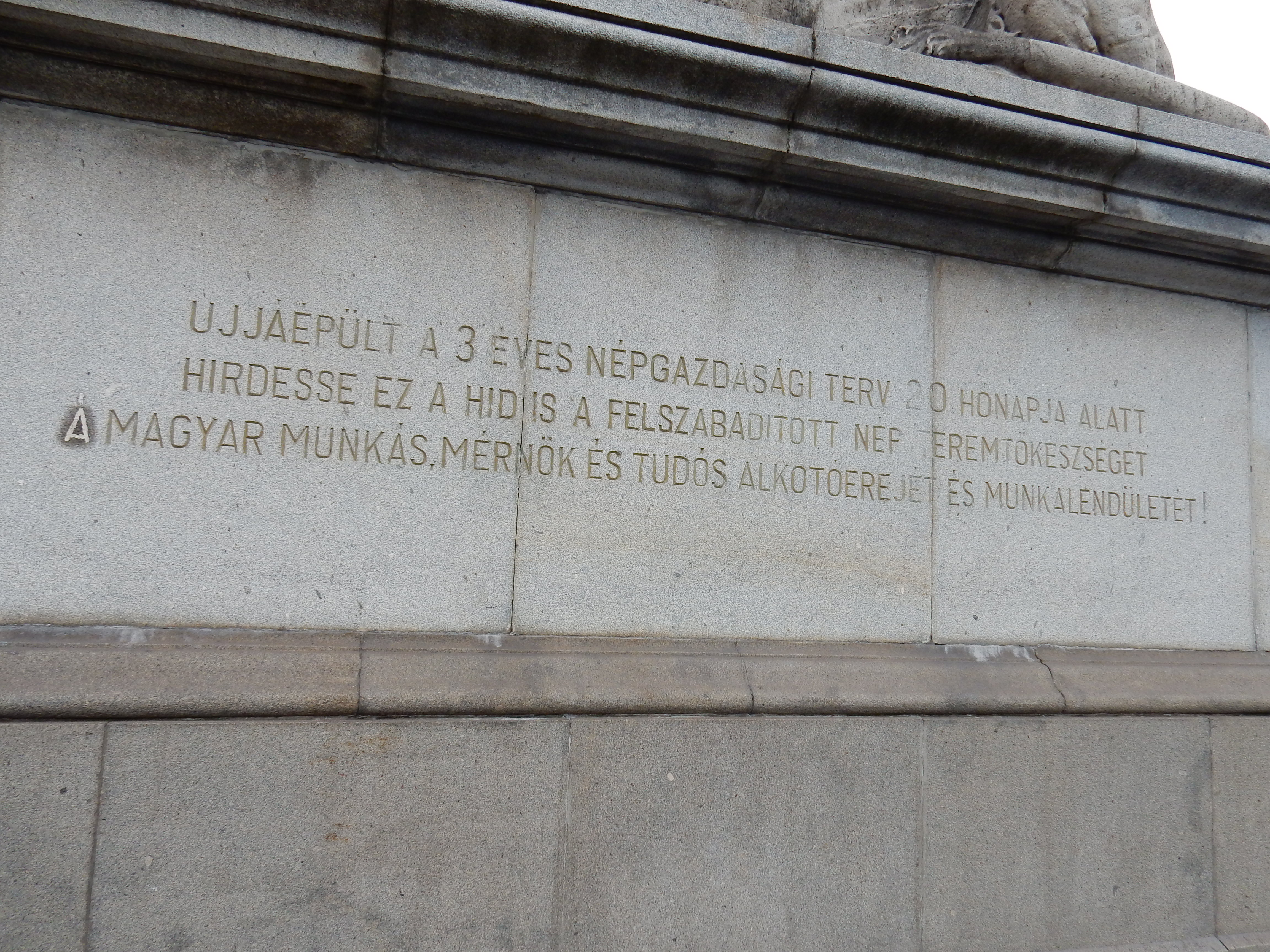 Budapest hídjai közül az öt legrégebben álló mindegyikén található kisebb-nagyobb, kommunista stílusú márványtábla. Bár az elsőként újjáépített Szabadság híd már 1946 augusztusában elkészült, a pesti hídfő északi vámszedőházának homlokzatán látható felirat stílusa már sejteti a közelgő kommunista hatalomátvételt.