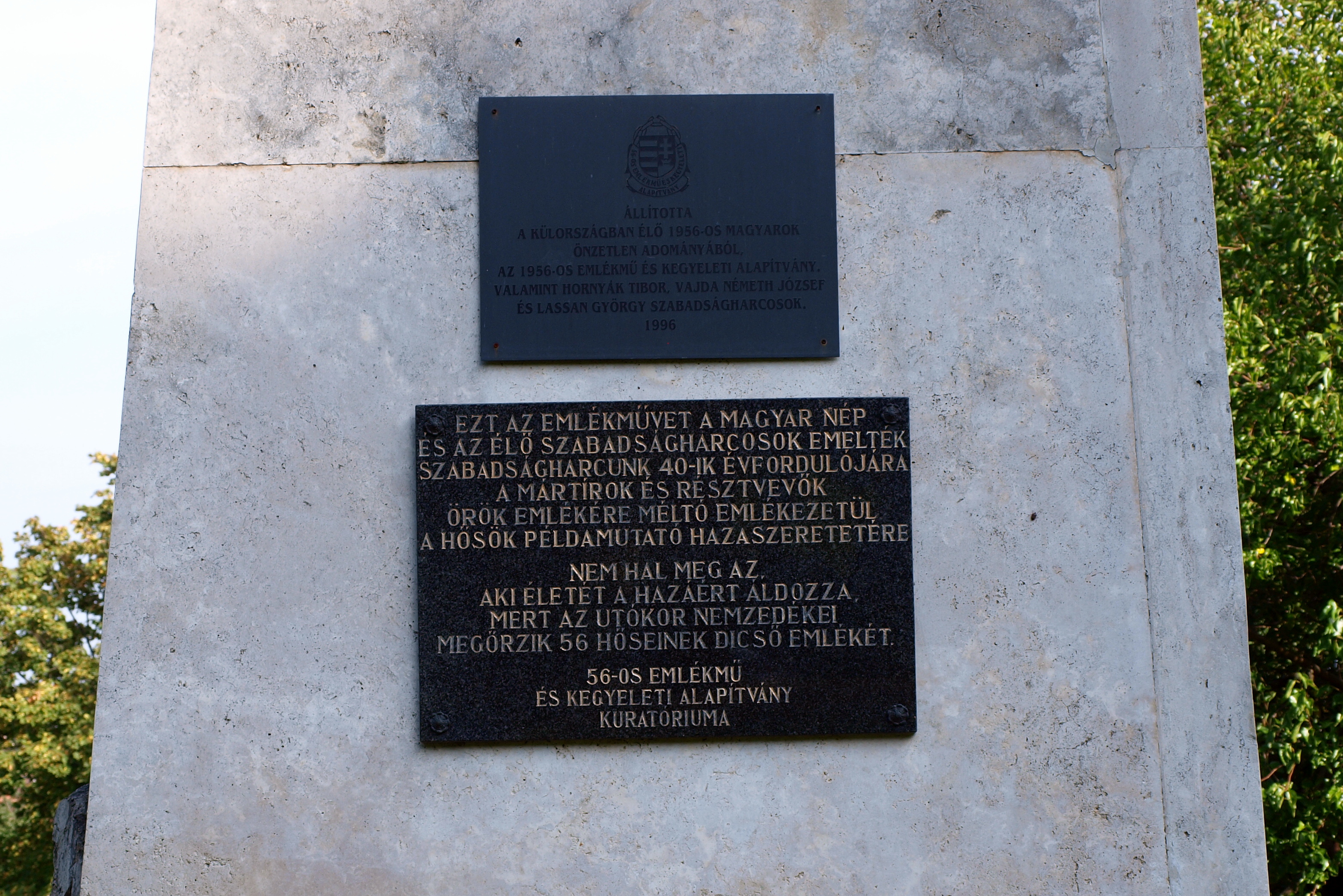 A „külországban élő 1956-os magyarok” és néhány név szerint is feltüntetett magánszemély (Horváth Tibor, Vajda Németh József és Lassan György) önzetlen adományából állított emlékmű a megrendelők elképzelése alapján a Los Angelesben 1969-ben (tehát az elsők között) felállított magyar szabadságharcos emlékmű ikerpárjának készült. Amerikában a 16 méter magas obeliszket egy kiterjesztett szárnyú turul ékesíti, domborművén pedig a forradalmi lyukas zászlóval vonulók láthatók. Lényegében ezt láthatjuk itthon is Ócsai Károly alkotásán, csak egy kicsit más, talán absztraktabb megfogalmazásban.