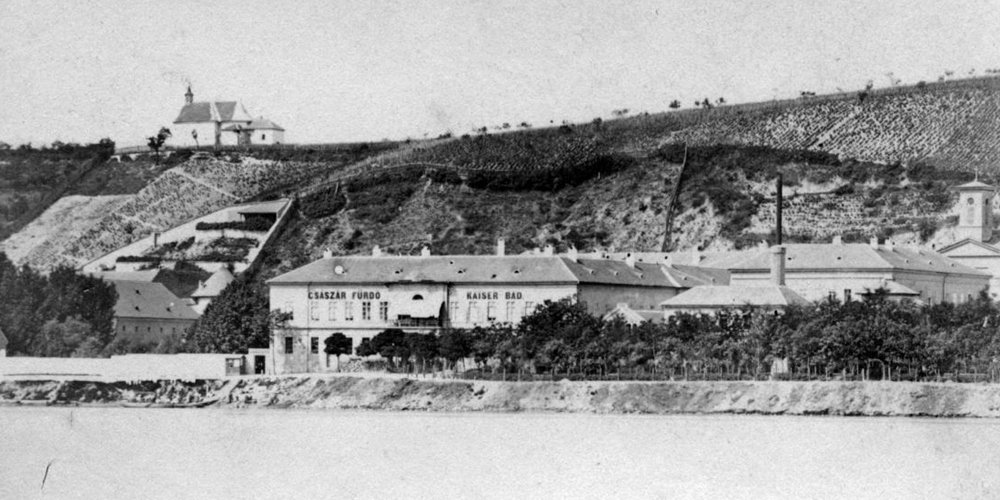 A Császár fürdő klasszicista, 1841–1842 között emelt Hild József-féle épületegyüttese uralta a látványt. A háttérben látszik a Szent István-kápolna tornya, amit szintén ő tervezett.