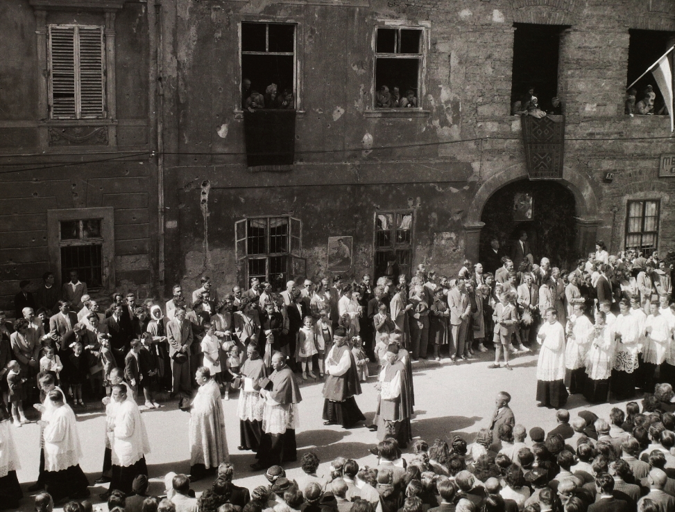 És körmenet újra, a világháborúban szétlőtt, de már úgy-ahogy rendbehozott Várnegyedben. Hamarosan betiltották (Fotó: Fortepan)