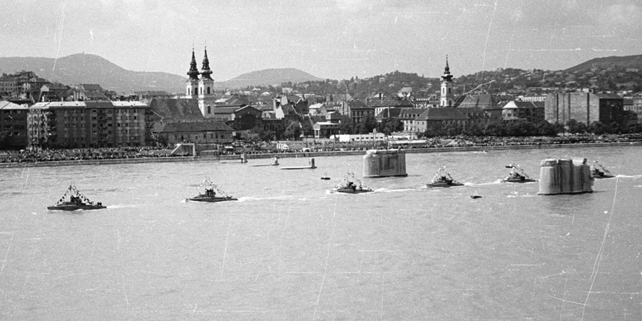 Vízi parádé, 1960. A Dunában még ott állnak az egykori Kossuth híd pillérjei (Fotó: Fortepan)