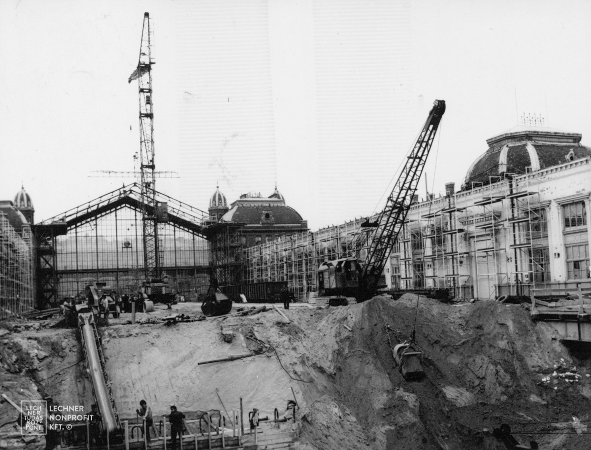 Az új nagycsarnok szerkezetének szerelése a régi indóház tetejéről (Fotó: Uvaterv/Lechner Tudásközpont fotótára, Műemlékvédelem folyóirat, 1976. 1.)