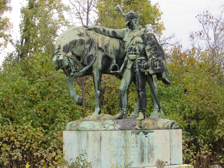 Stróbl Alajos első figurális síremlékműve szintén egy hivatásos katona, Henneberg Károly altábornagy számára készült 1890-ben. A bronzszobor egy lova mellett álló huszárt ábrázol. Stróbl kortársaitól eltérően nem vonzódott különösen a lovas szobrokhoz, itt is úgy jeleníti meg a két szereplőt, hogy egymás mellett állnak. A ló mozdulata és lehajtott feje az összetartozást és az engedelmességet fejezi ki a gazdája és a sors iránt. Egyetlen lovas szobrot mintáz majd, ez a budai várban álló Szent István-szobor.