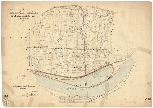 Az első tervlap szigorú négyzethálós utcákkal szabdalt területet tár elénk, öt nagyobb, négyszög alakú térrel. Ezek közül az egyik a terület mértani közepén, a többi négy négyszög alakban, egyenletesen elhelyezve szerepel. Érdekesség, hogy erre később rávezették a készülő vasúti vonalat és a hidat, és ceruzával is tettek rá később jelzéseket.