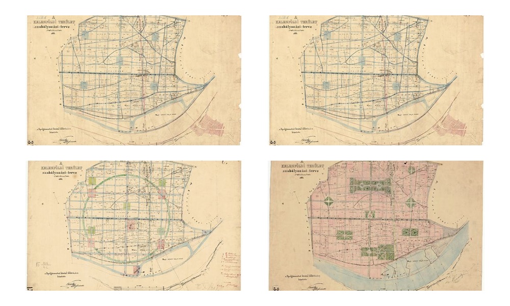 Varásdy Lipót összesen négy különböző elképzelést vázolt fel, és egy külön tervlapon az új városész közlekedését is. A tervek tájolása szokatlan, nem észak-déli, hanem kelet-nyugati, így a Duna a térképlap alján, míg a Gellért-hegy szőlői a térképlapok jobb oldalán helyezkednek el.