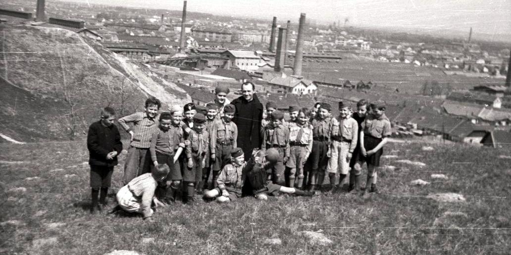 Kiránduló gyerekek az 1930-as években: az óbudai hegyoldal kopár, füves, háttérben egy téglagyár (Forrás: Fortepan)