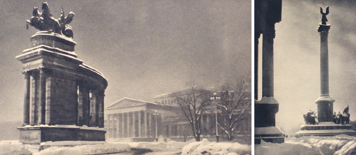 Szép példája a szobrokról készült téli képes levelezőlapoknak a behavazott Millenniumi emlékművet és a Hősök terét ábrázoló képpár az 1920-as évekből (2)