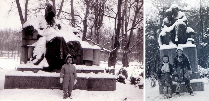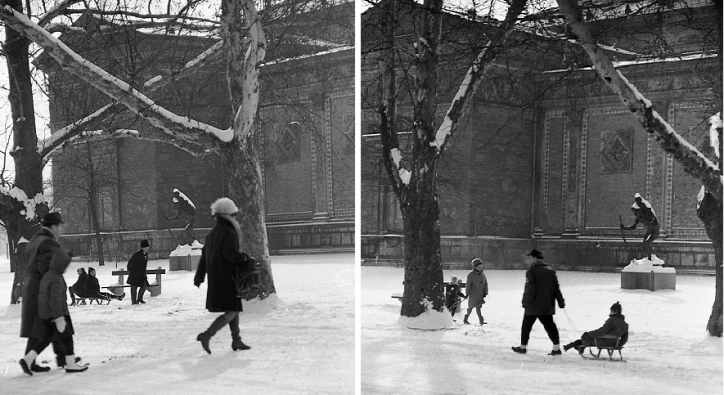 Egy meleg kezeslábasba öltözött lurkó Anonymus hótakaróba burkolódzott szobra előtt az 1960-as években (balra), jobbra pedig a hógolyózástól kipirult rosszcsontok Stróbl Alajos Olvasó nők szobránál 1938-ban (3)