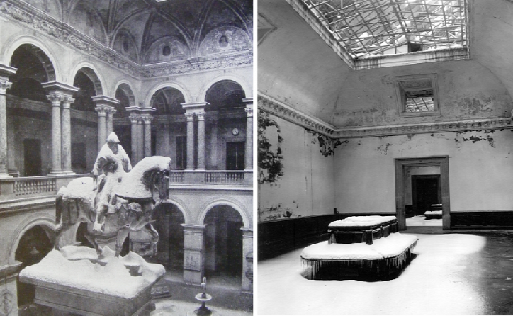 Amint a korabeli felvételeken is látható, hó lepte a méretük miatt nem mozdítható szobrokat, az eső és a hólé befolyt a kiállítási termekbe, jégcsapok lógtak a berendezési tárgyakon (4)
