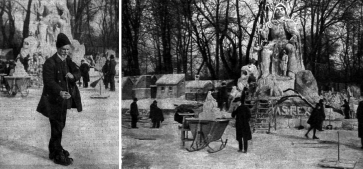 A középkori Pest hóval borított házait ábrázoló díszlet a tó partján (balról), a jobb oldali képen pedig a pipázó Stróbl Alajos és a jégünnepély szervezői az elkészült alkotás előtt. A király méltóságteljes, ülő alakját, amint a felvételen látható, két oldalról hóból formázott oroszlánok őrizték (7)