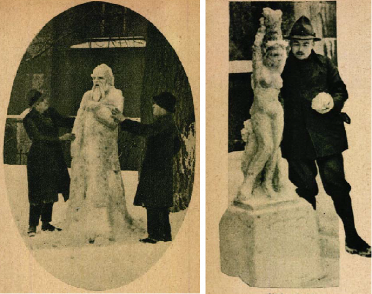 A tél tündére, Schrotta J. Frigyes első díjat nyert hószobra (balról), jobbra pedig a harmadik díjjal elismert Prometheus, Szomor László, Nagy Gyula és Kaszás Miklós szobrásznövendékek közös kompozíciója (11)
