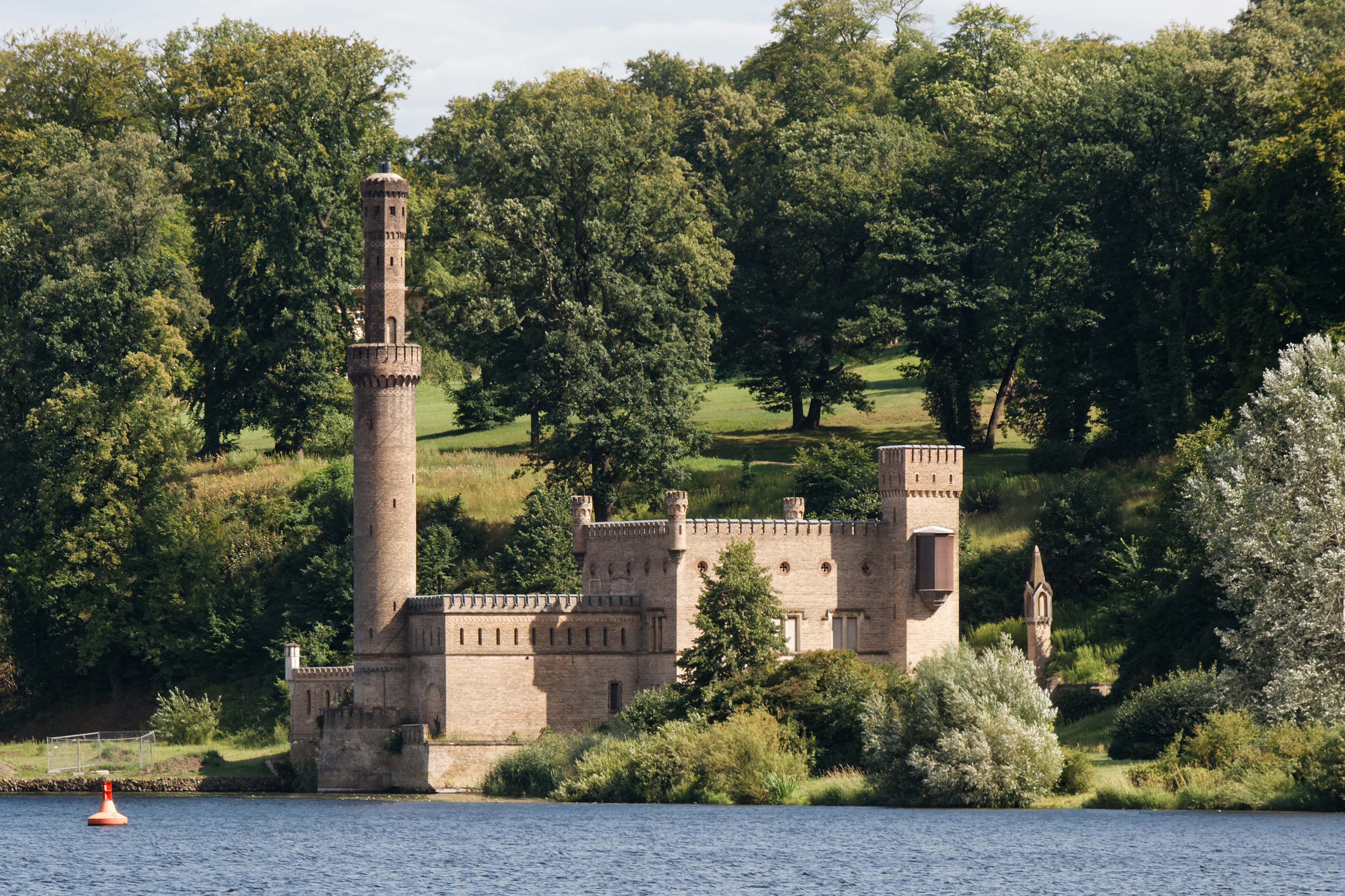 Potsdam, a Park Babelsberg szivattyúháza, amely középkori várkastélyt idéz, szintén Ludwig Persius munkája