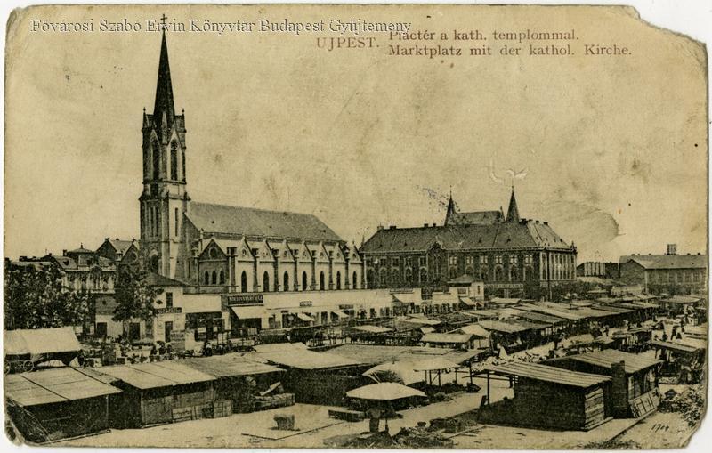 Újpest, piactér a katolikus templommal 1900-as években (Forrás: FSZEK Budapest-képarchívum)