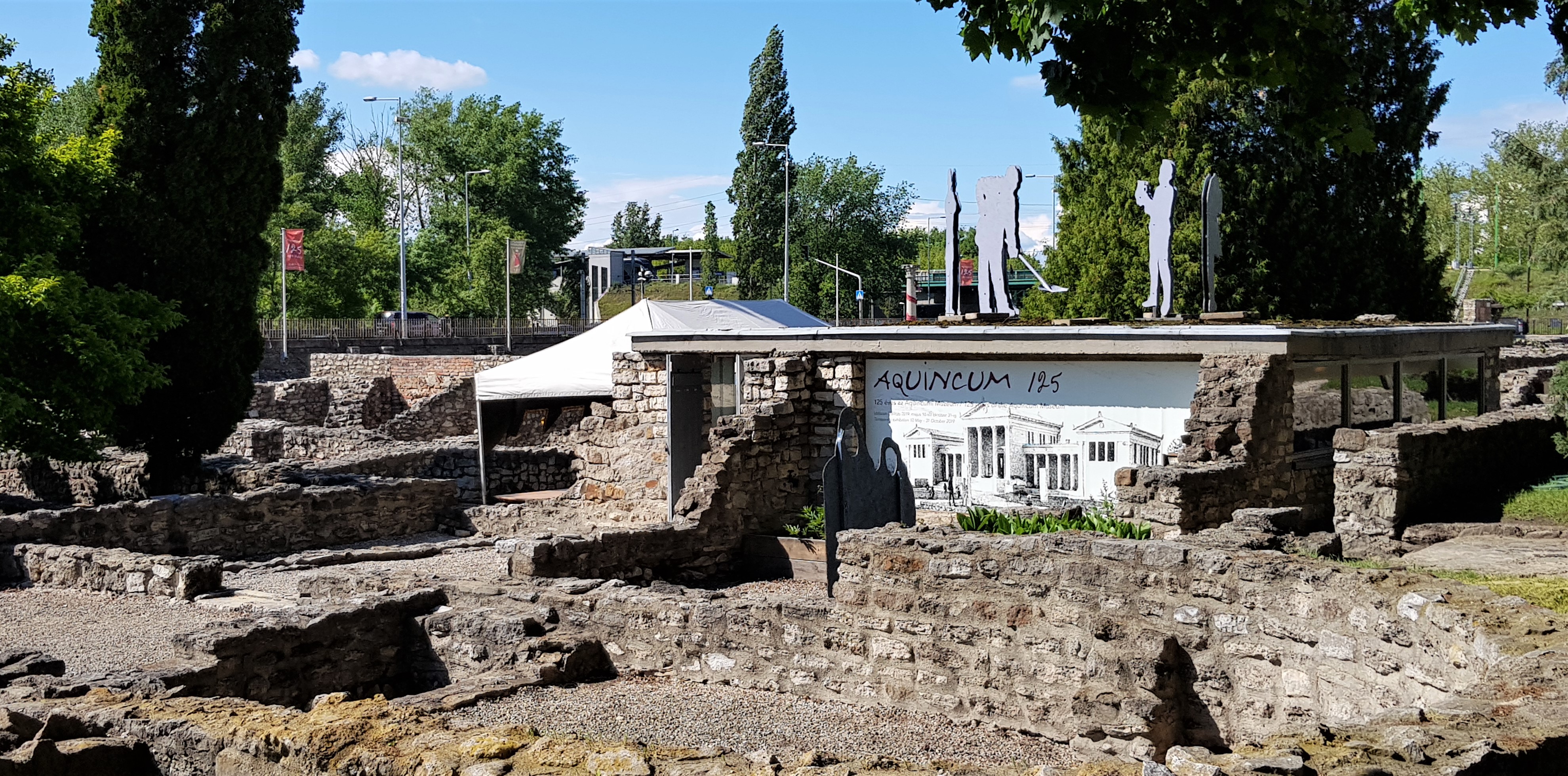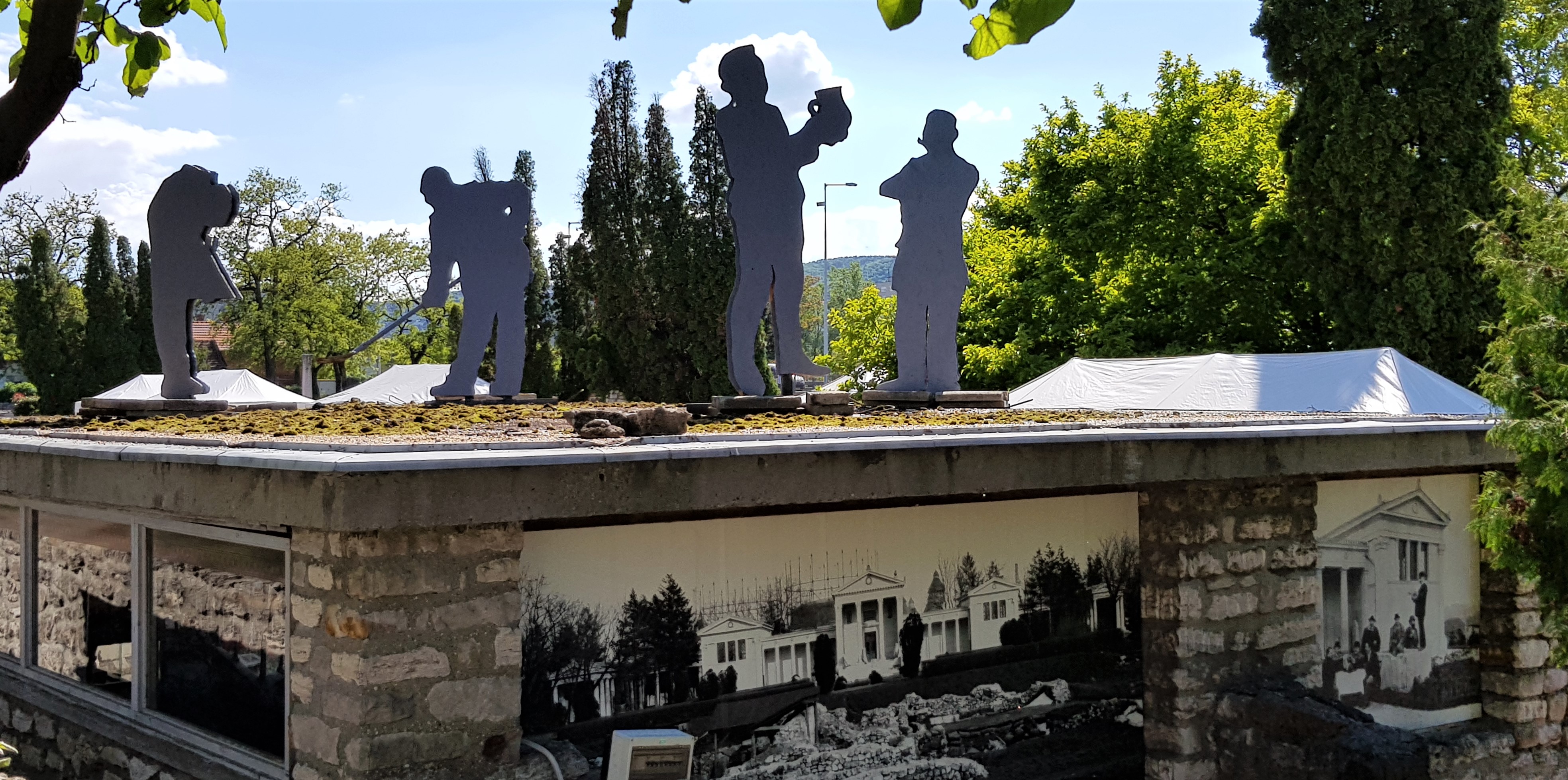 A kiállítási épület tetején látható árnyalakok egy ásatási jelenetet ábrázolnak (Fotó: pestbuda.hu)