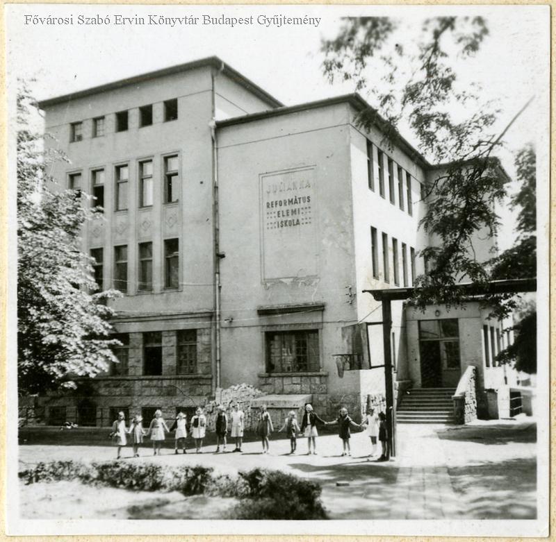 A Julianna Református Elemi Iskola épülete, gyerekek csoportja az 1940-es években (Fotó: FSZEK Budapest-képarchívum)