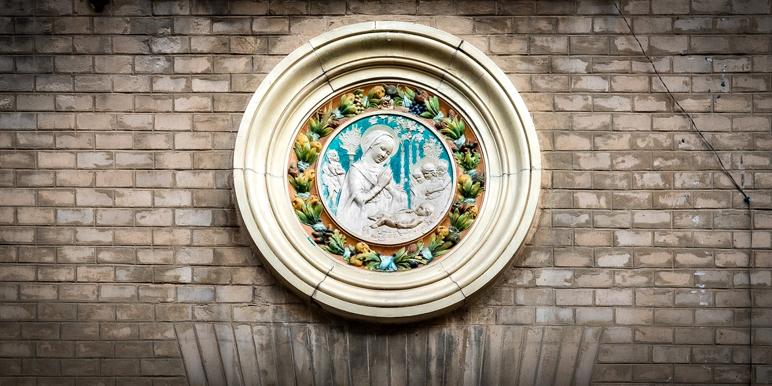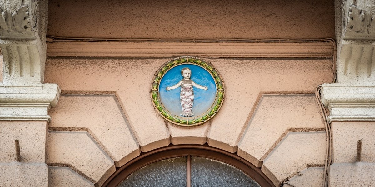 Az eredeti dombormű Firenzében, az egykori Ospedale degli Innoncenti árvaház árkádsorán (Fotó: Baranyi Elek)