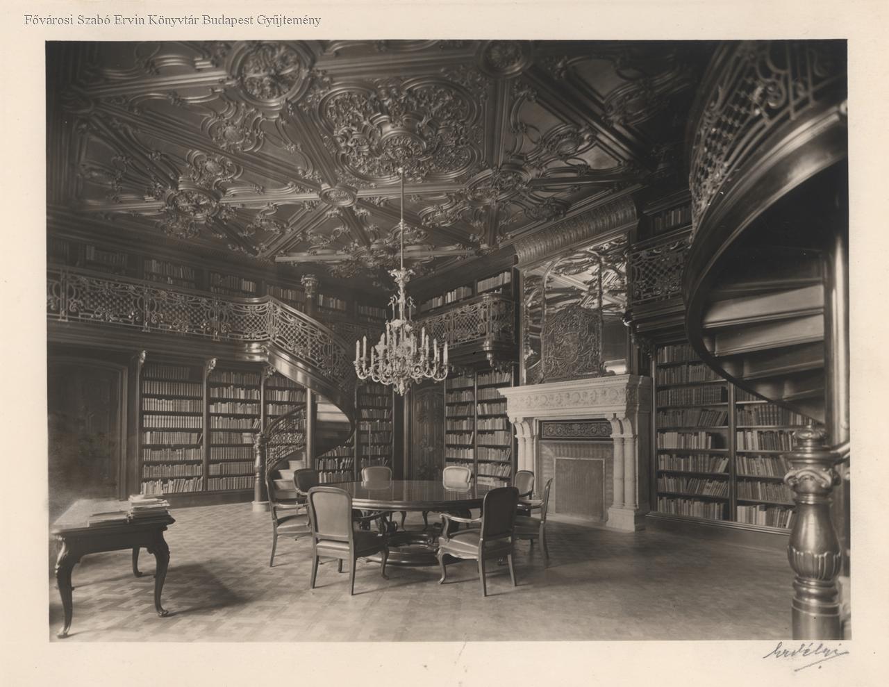 A Wenckheim-palota díszes falborítása és falépcsői. A palota egykori dohányzótermét később a Fővárosi Könyvtár Budapest Gyűjteménye vette birtokba. A fénykép 1931-ben készült (Fotó: FSZEK Budapest Gyűjtemény).