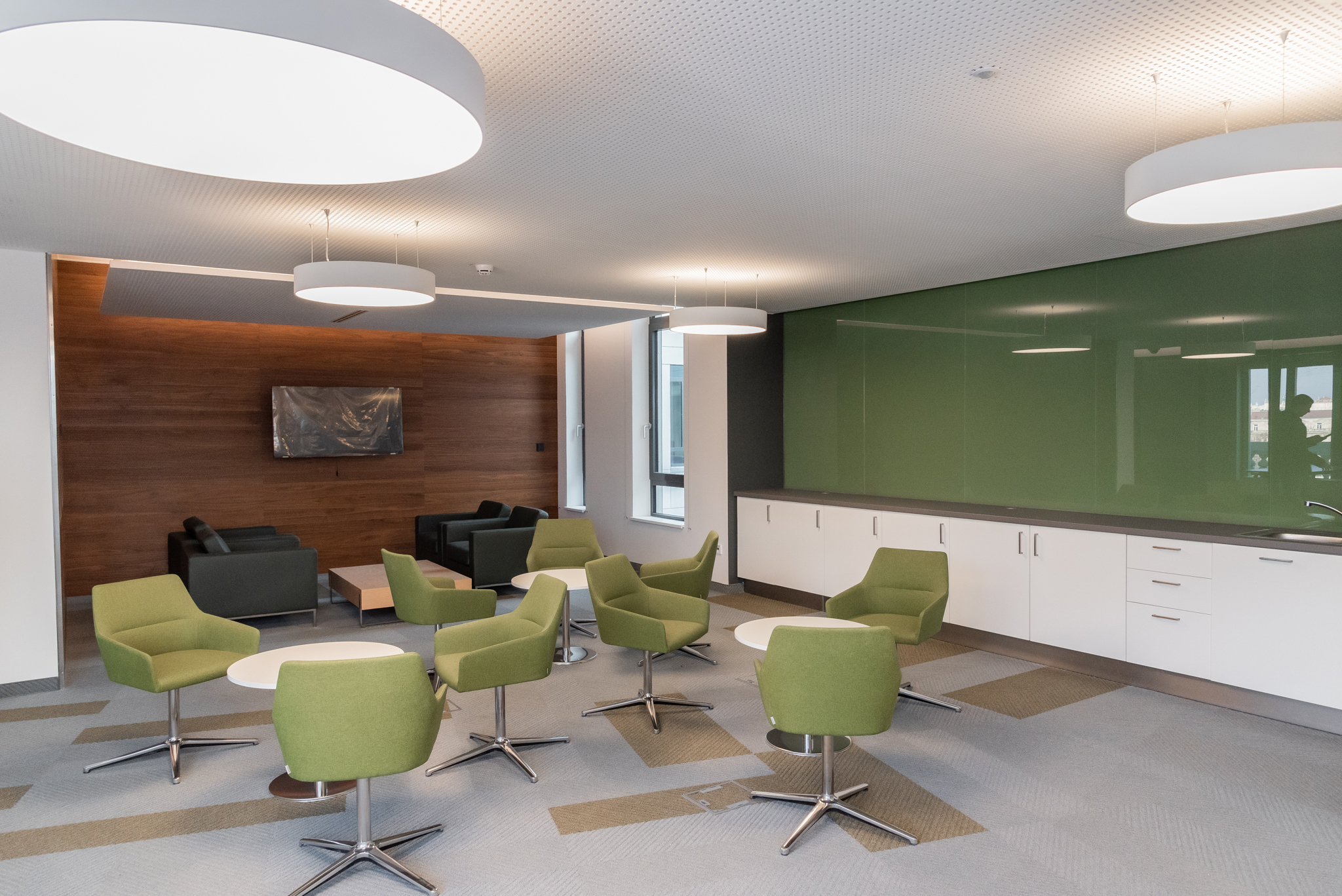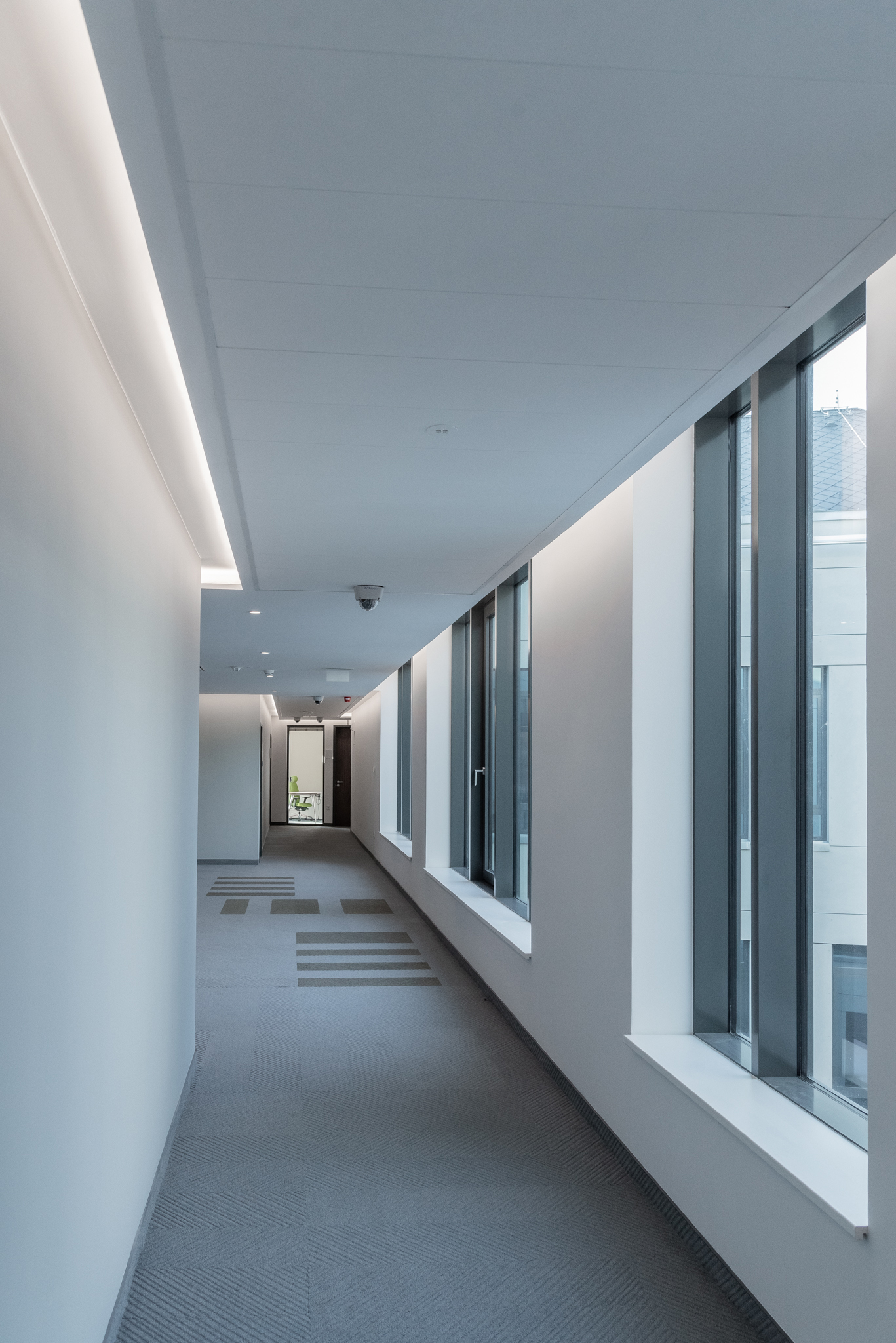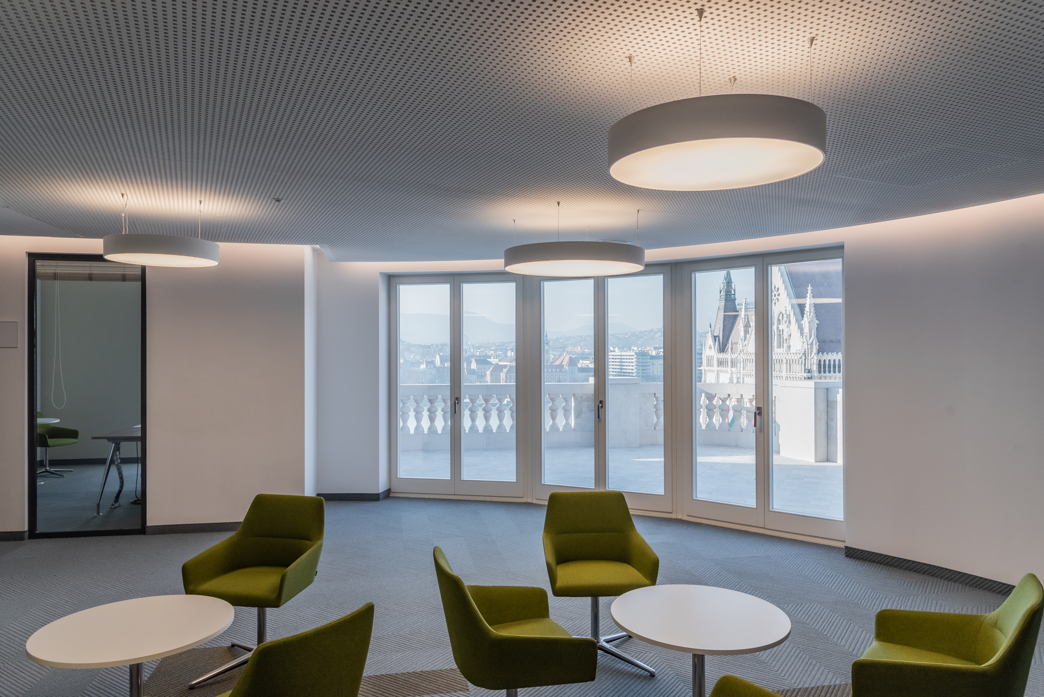 Az irodaépületen jelenleg a végső simításokat végzik. Az irodák és tárgyalók közül egyet-kettőt megnézünk, de csak az ötödik és hatodik emeleten. Az épületet többnyire a fehér és a szürke színek, valamint natúr fa vagy krómozott acél felületek jellemzik.