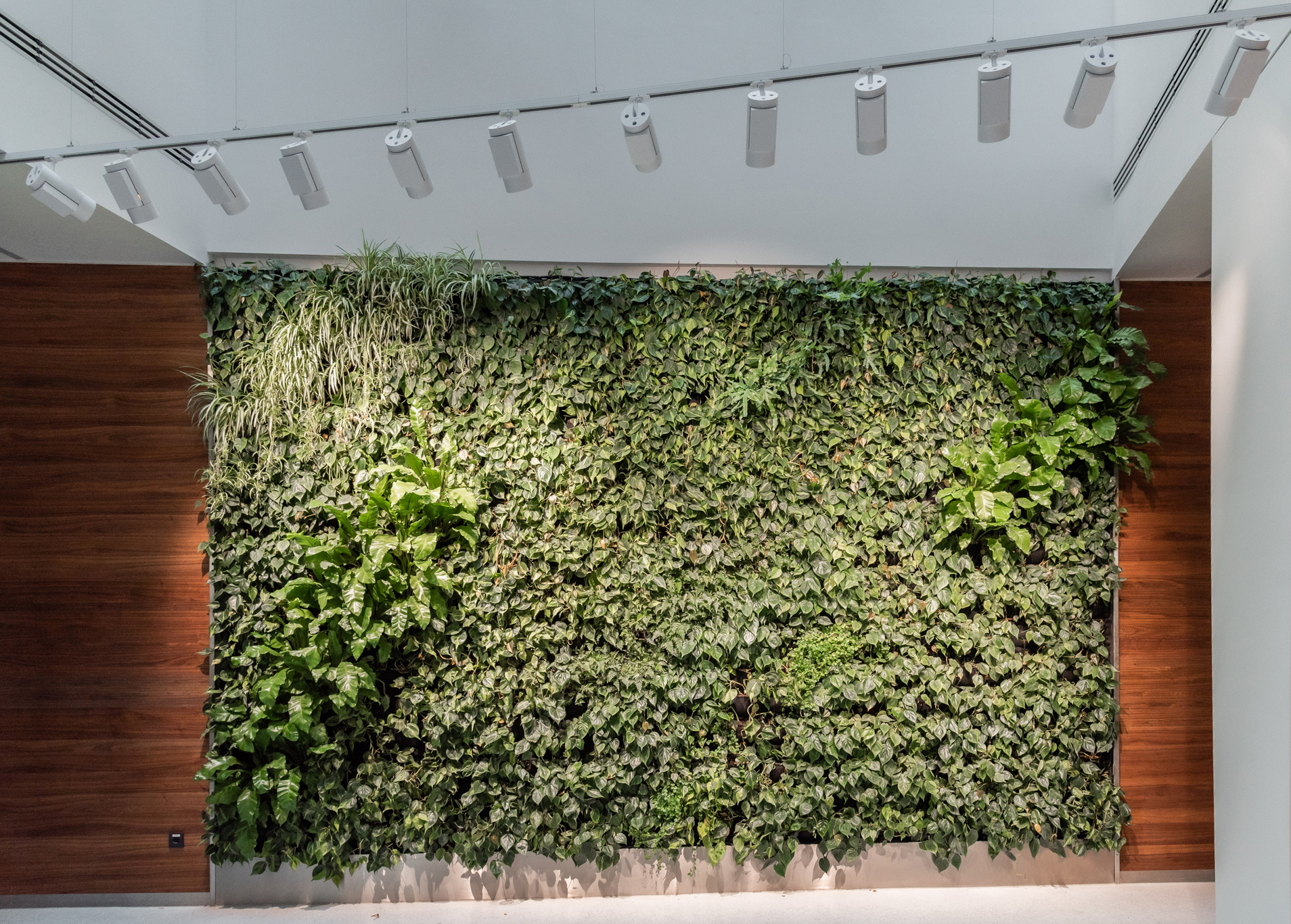 Az irodaépületbe visszaérve megállunk egy pillanatra az aulában, ahol hatalmas, élő növényekkel borított zöld falfelület fogadja a belépőket, ami színt és életet csempész az amúgy letisztult, kicsit talán komor térbe.