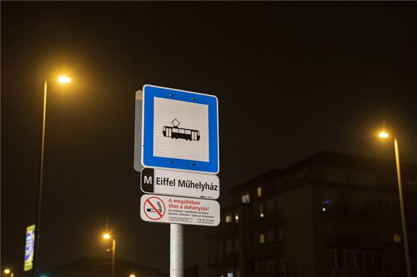 A 28-as, a 28A és a 62-es villamos Eiffel Műhelyház megállójának táblája (Fotó: MTI/Mónus Márton)