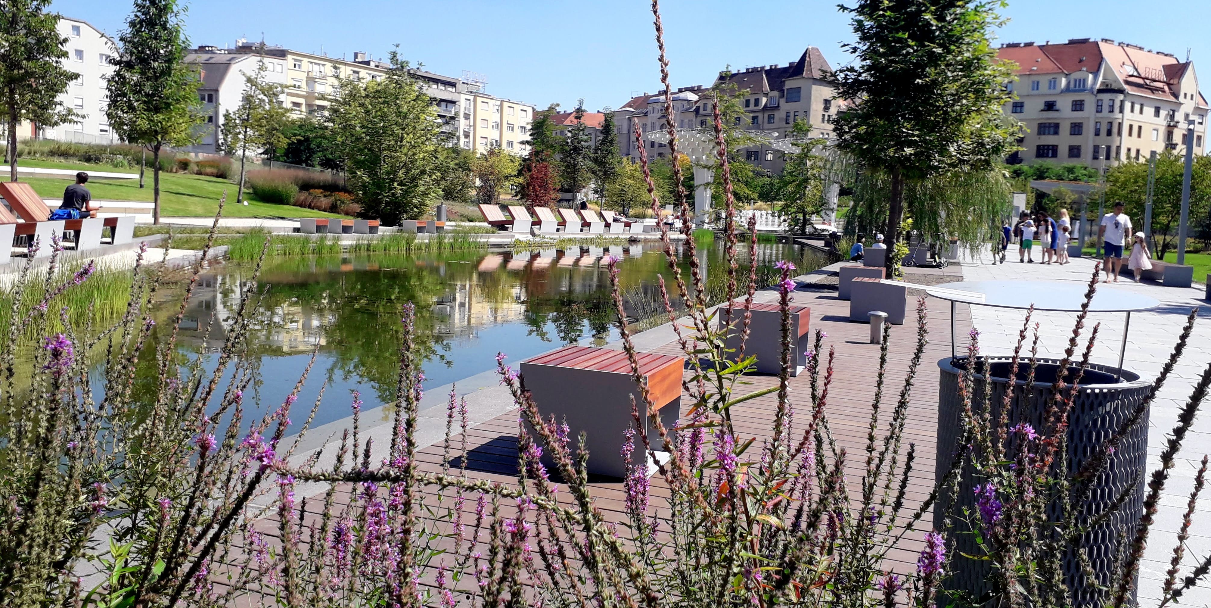 Aztán körbenéztünk a betonfenyők tövében: feltárult a kis tó. Halak (még?) nincsenek benne, csak néhány molnárka szaladgált lelkesen a víz színén, a vízinövények azonban már szépen hajladoztak, a tavirózsa is virágzott. A vízpartról a Kis-Rókus utca felé épített „dombvidék” látszott (és arrafelé van egy bejárata is a parknak). A másik irányba pedig a Mammut épületét szinte teljesen kitakaró függőleges növényfal sötétlett fel: ez az úgynevezett függőkert. Mindenütt szögletes, dizájnos padok, kukák, több ivókút, a tóparton pihenőfotelek.