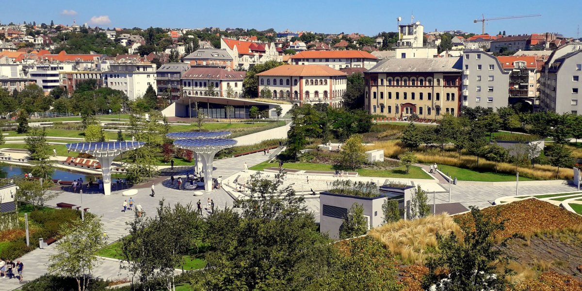 Felmentünk természetesen a park legvitathatóbb objektumának, az úgynevezett függőkertnek a tetejére is. Innen térképszerűn feltárul a park egésze, láthatjuk a sétányok vonalvezetését, az egész terület környezethez való illeszkedését. Kicsit még idegenek egymásnak, ez vitathatatlan: a XIX. század végén, XX. század elején épült környező épületek kerültek itt javarészt párbeszédbe a XXI. századdal. Ami kortársa volna, az üzletház, de azt éppen a függőkert takarja – és ez nem is baj, hisz az különösebb esztétikai minőséget nem képvisel.