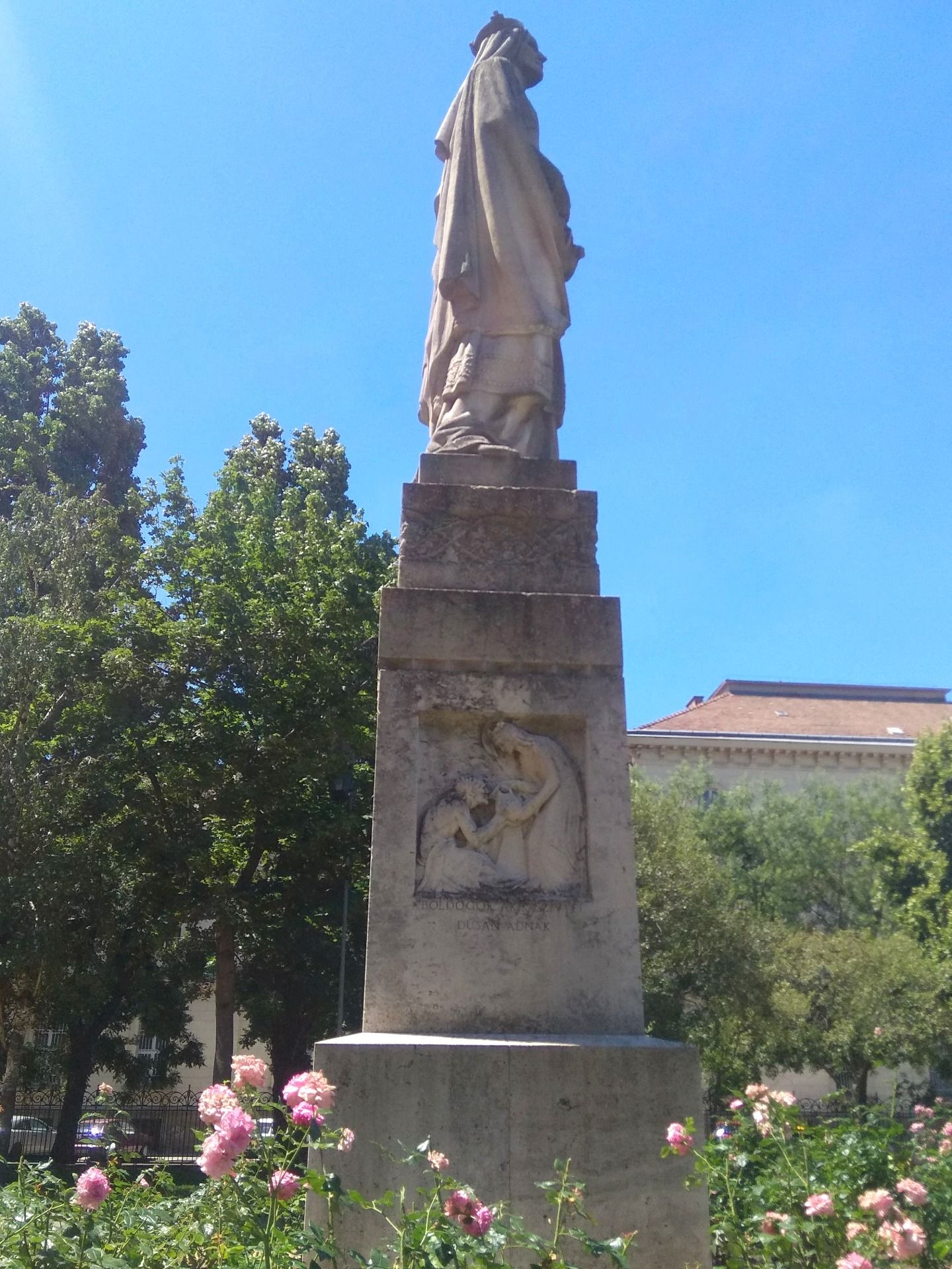 Árpád-házi Szent Erzsébet szobra a Rózsák terén, a templom előtt 1937-ben (Fotó: Fortepan/Képszám: 118758)