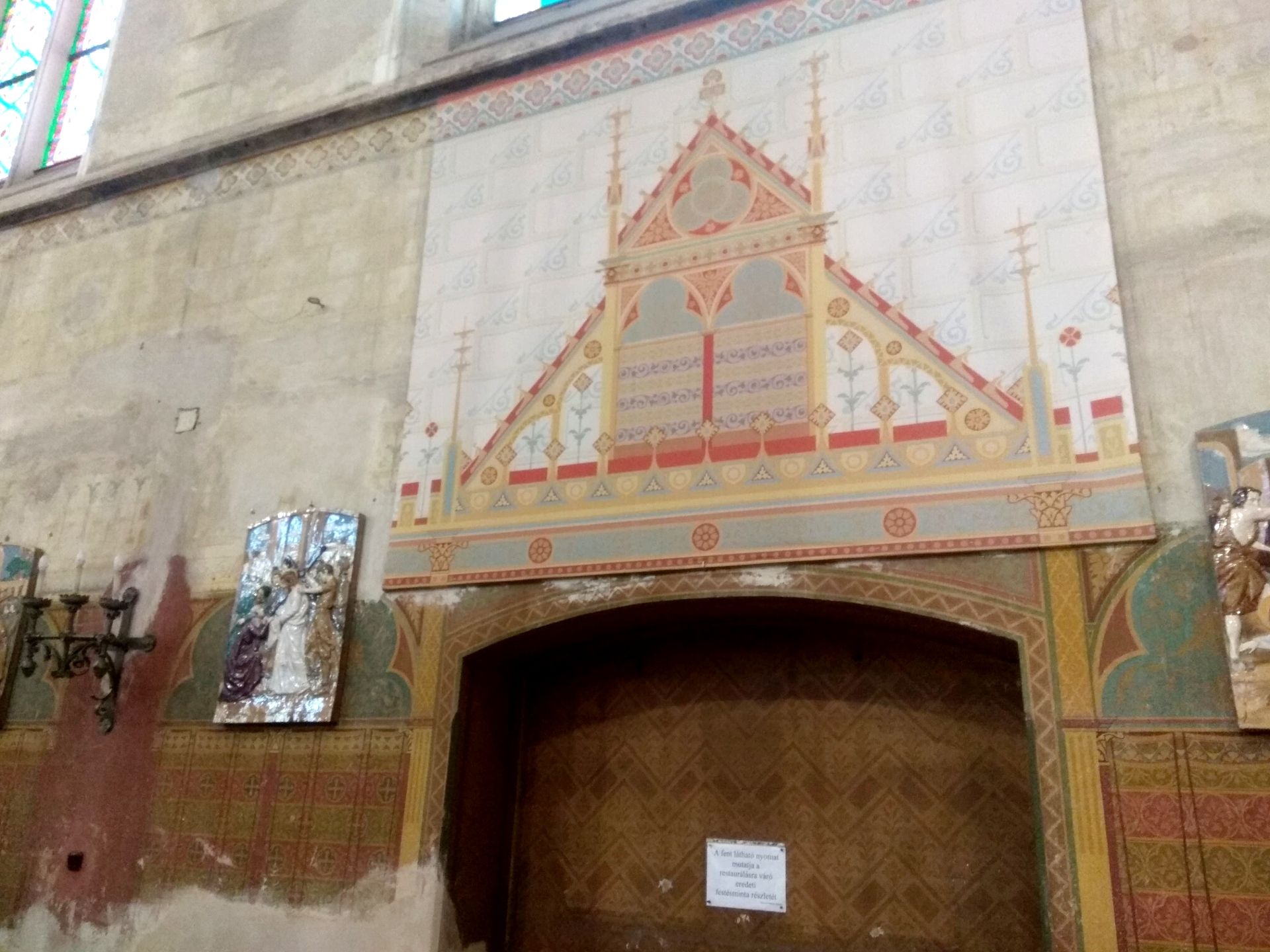 A megtalálható minták és töredékek alapján rekonstruálták az egykori díszítéseket, a restaurálási munkák a főhajó falán még nem fejeződtek be teljesen (Fotó: pestbuda.hu)