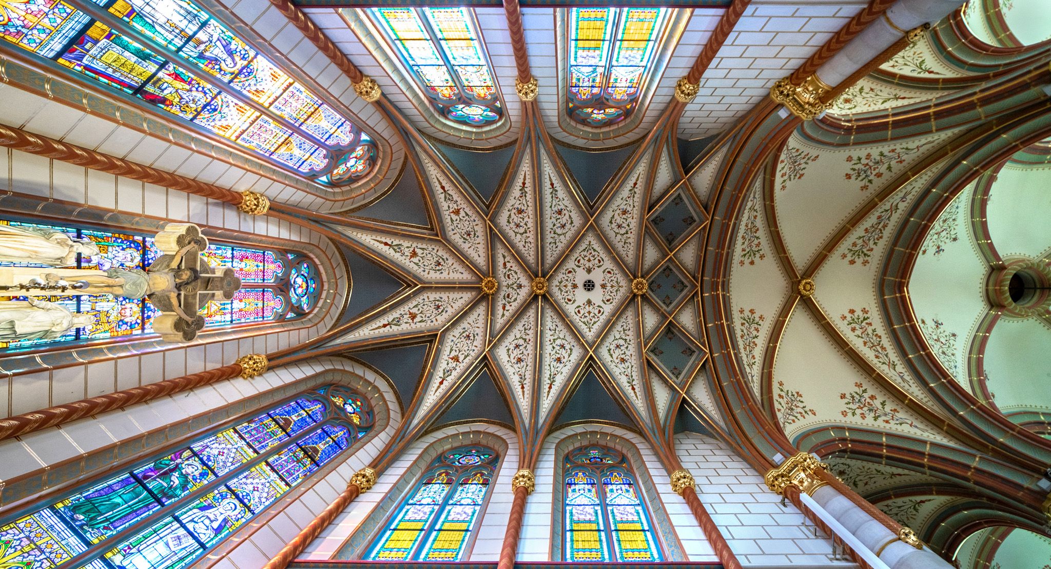 Díszes fejezetű oszlopok, neogótikus motívumokkal díszített ornamentális festés (Fotó: Both Balázs/pestbuda.hu)