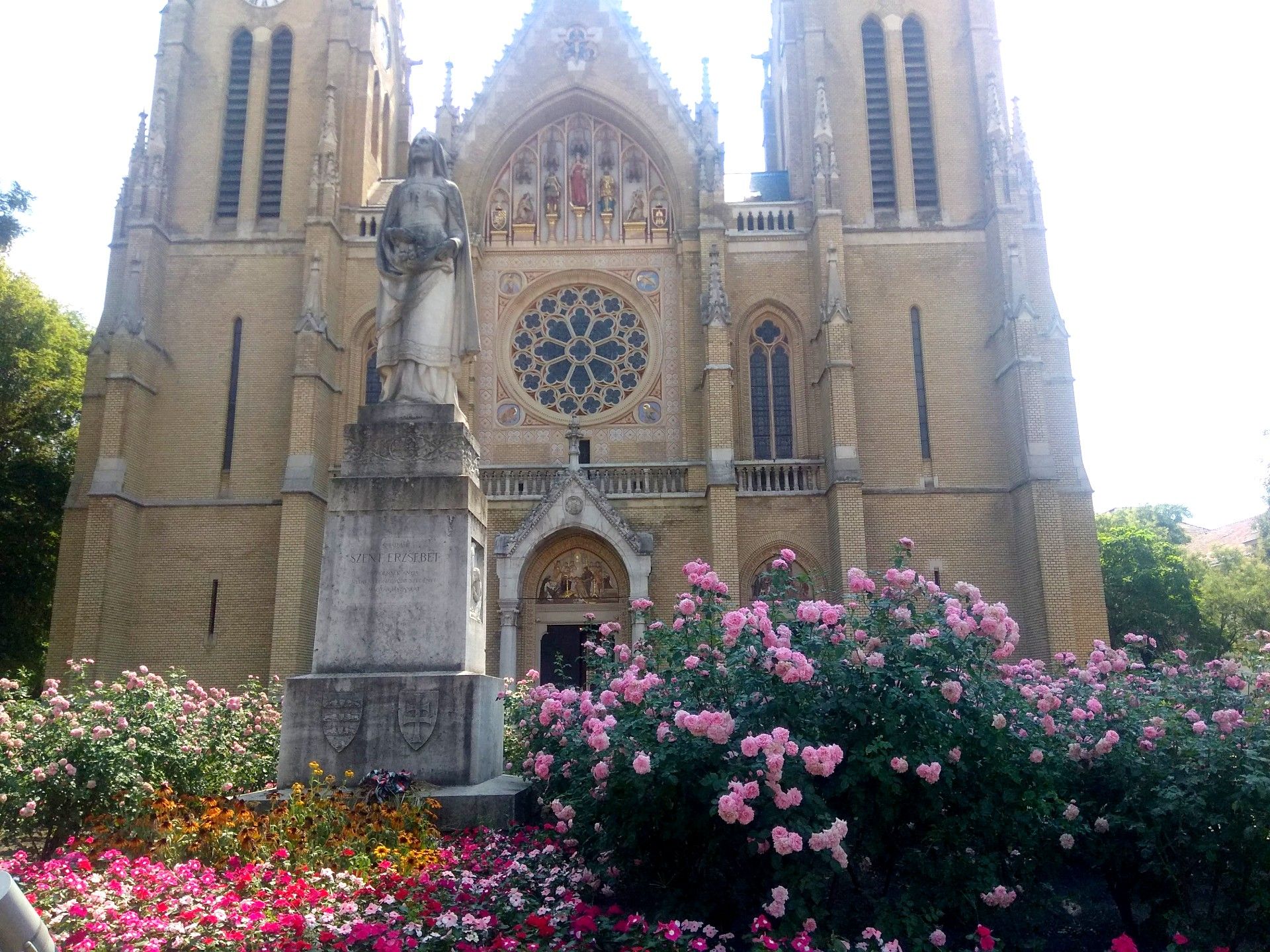 A templom előtti téren 1932-ben állították fel Damkó József Szent Erzsébet szobrát, a szent halálának 700. évfordulóján. A teret ekkor nevezték el Szegényház térről Rózsák terének, ami Szent Erzsébetnek, a szegények patrónusának rózsacsodájára utal. A legenda szerint Erzsébet kenyeret vitt a szegényeknek a kötényébe rejtve, azok rózsákká változtak, amikor a férje kérdőre vonta. A templom belső terében sok helyen megjelenik a rózsa és a virágmotívumok. A rózsaablak keretében, a falakon, a mennyezeten és az üvegablakokon is.
