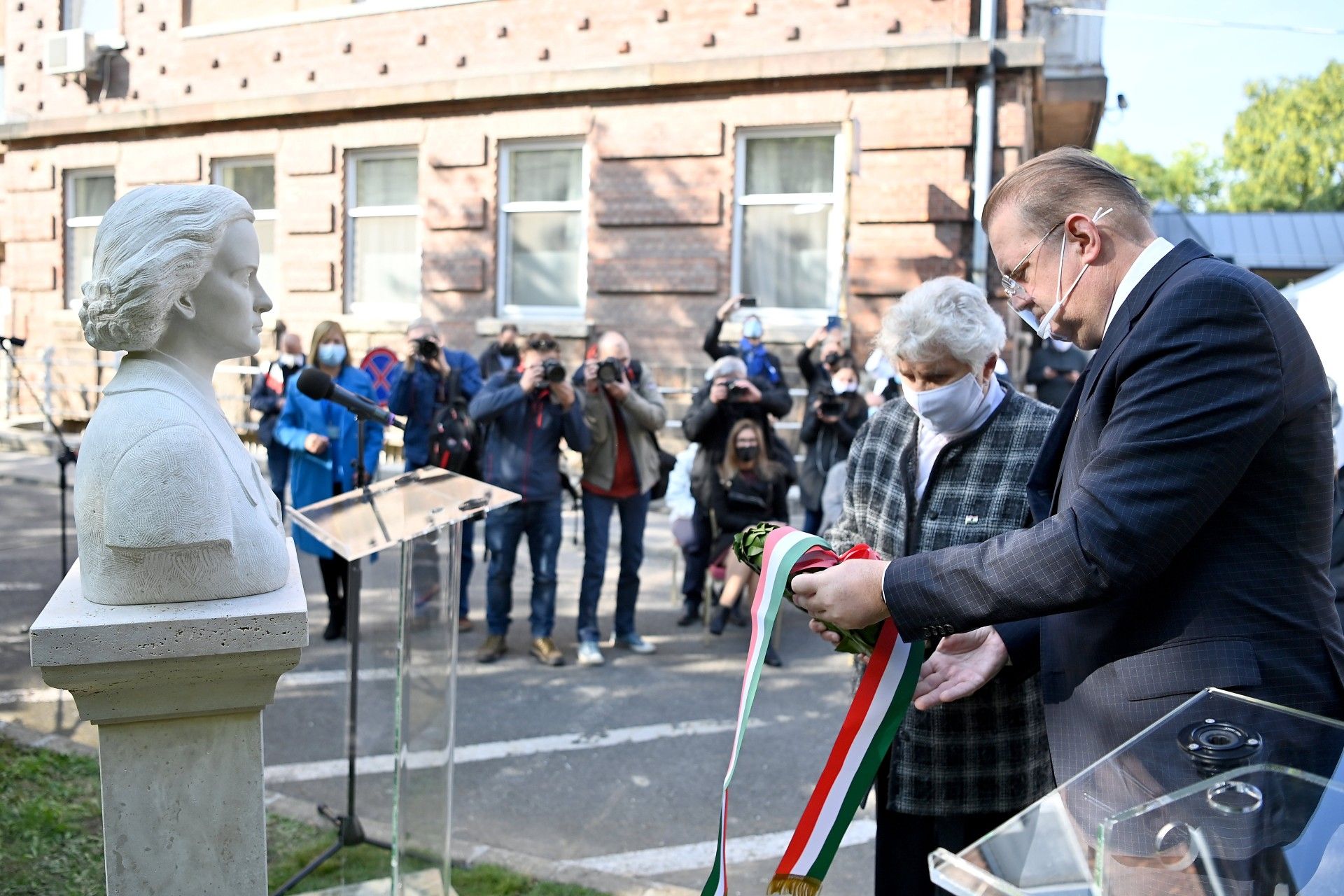 Wittner Mária és Bodnár Attila, a Bajcsy-Zsilinszky Kórház és Rendelőintézet főigazgatója koszorúz Tóth Ilona mellszobrának avatási ünnepségén a Bajcsy-Zsilinszky Kórház udvarán (Fotó: MTI/Illyés Tibor)