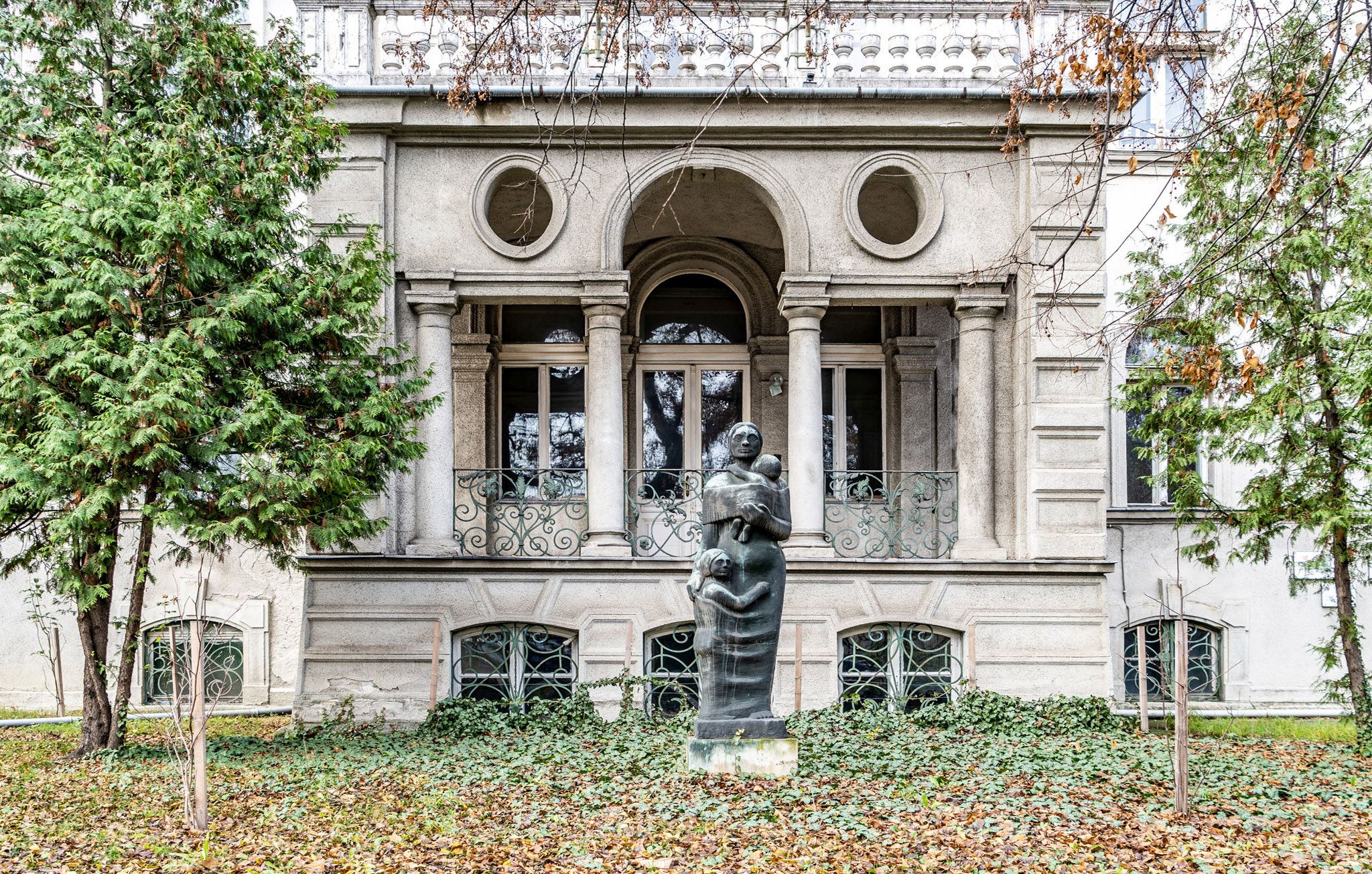 A főhomlokzat loggiája, az előtérben egy édesanyát gyermekeivel ábrázoló szobor látható, amely már a Magyar Nők Szövetségéhez köthetó (Fotó: Both Balázs/pestbuda.hu)