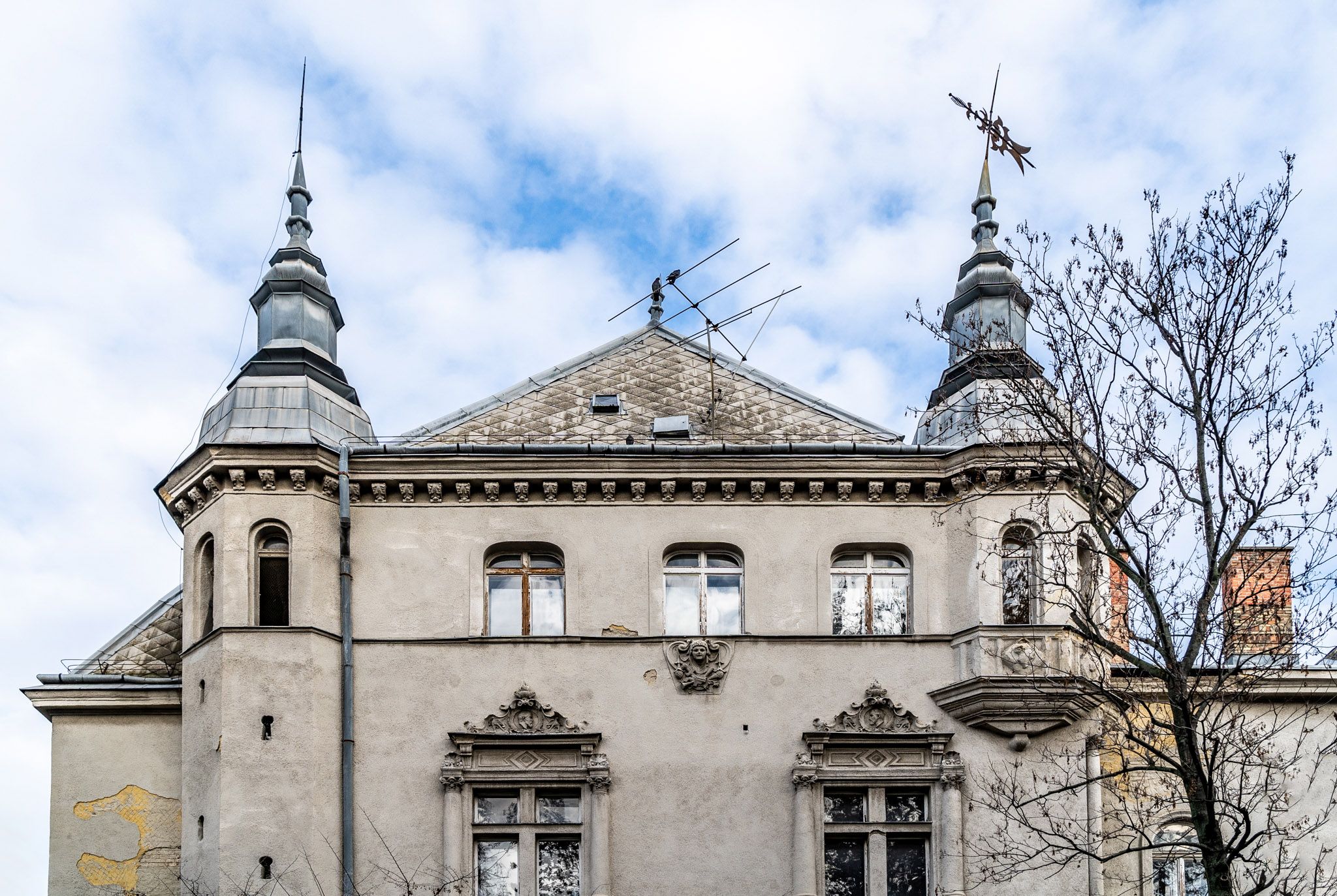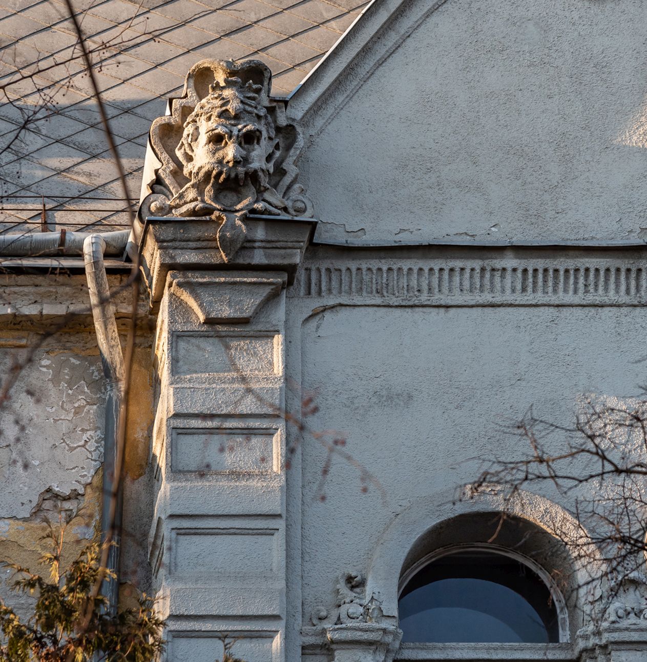 A főhomlokzat oromzatán látható maszkos dekoráció (Fotó: Both Balázs/pestbuda.hu)