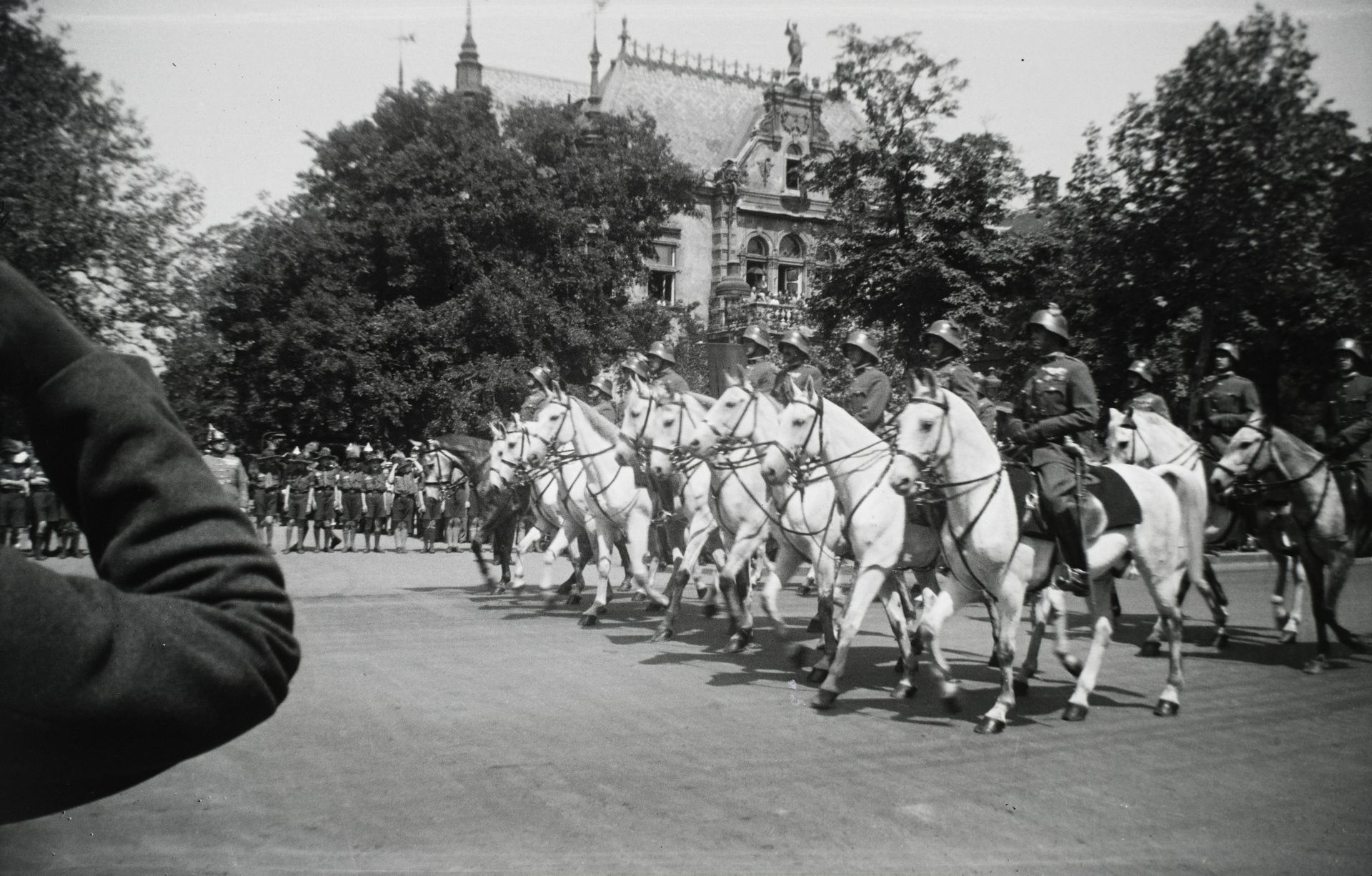 Katonai díszszemle III. Viktor Emánuel olasz király tiszteletére 1937-ben. A háttérben a Bulyovszky-villa látható (Fotó: Fortepan/Képszám: 120521)
