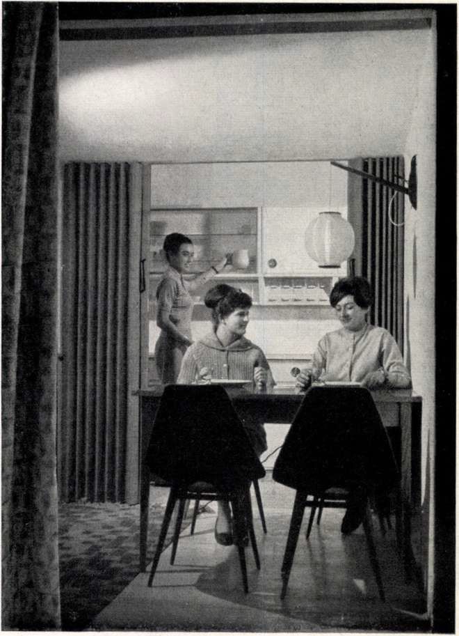 Az Óbudai kísérleti lakótelep terve, konyhával egybenyitható étkező mintaberendezése (Forrás: Magyar Építőművészet, 1961. 1. szám)