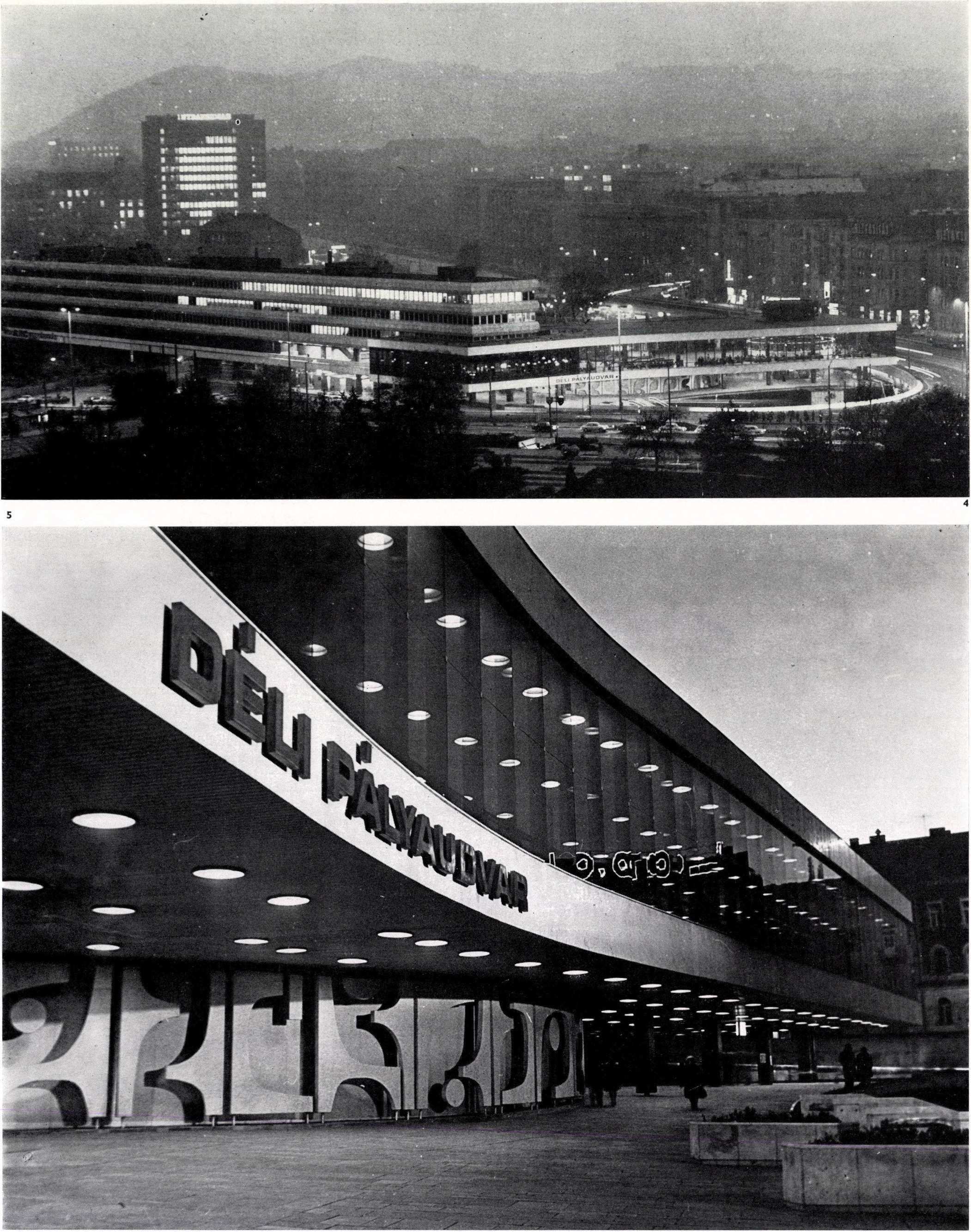 A Déli pályaudvar, az épület képe a magasból és a jellegzetes füstüveg homlokzat (Forrás: Magyar Építőművészet, 1978. 3. szám)