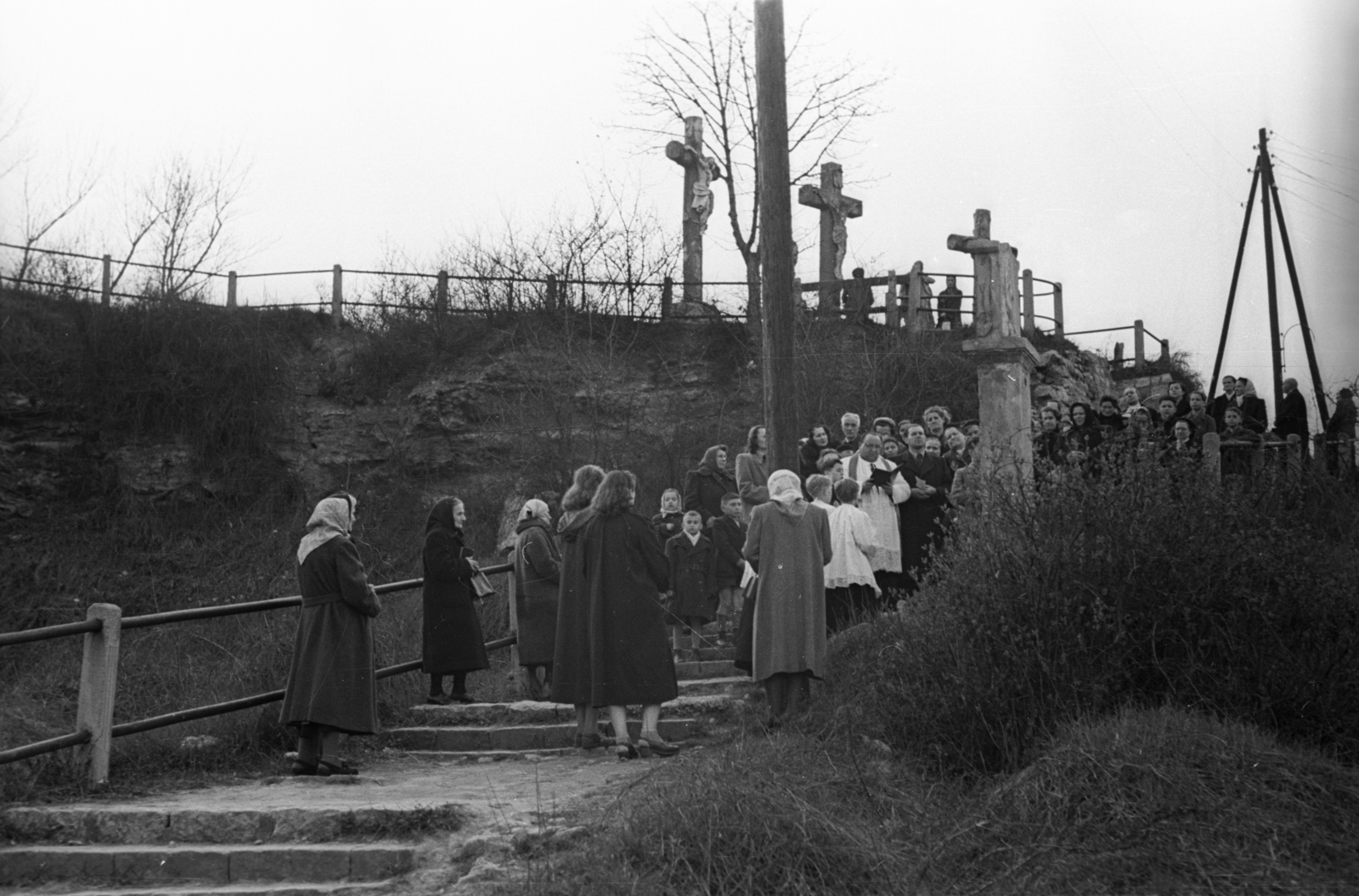 Keresztutat járnak a hívek 1956-ban a Doberdó úton a kiscelli kálváriánál (Fotó: Fortepan/Képszám: 108383)