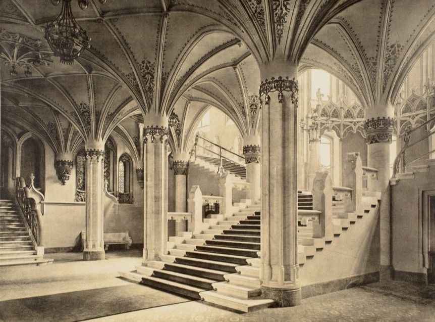 A Pénzügyminisztérium kívül-belül igényes, neogótikus stílusban készült. A díszlépcső a Haas Fülöp gyára által készített szőnyeggel (Fotó: Fellner Sándor: A Magyar Királyi Pénzügyministerium palotája, 1908)