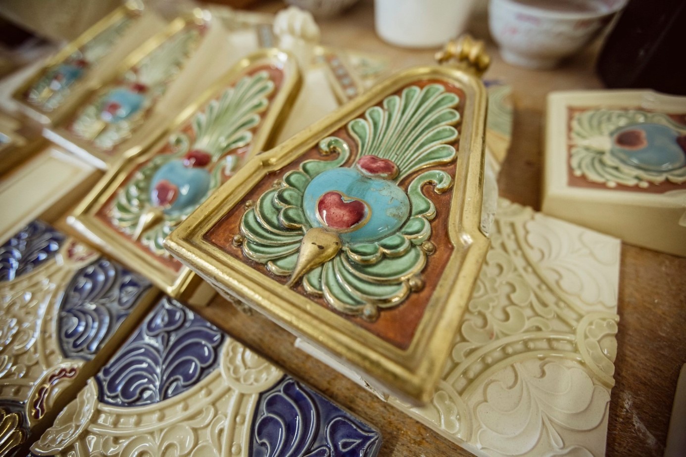 Szívek, bogyók, virágok. A díszítési rendszer a régi fotókon felismerhető volt, csupán két csempének nem ismerjük a részletmintáit (Fotó: Nemzeti Hauszmann Program)