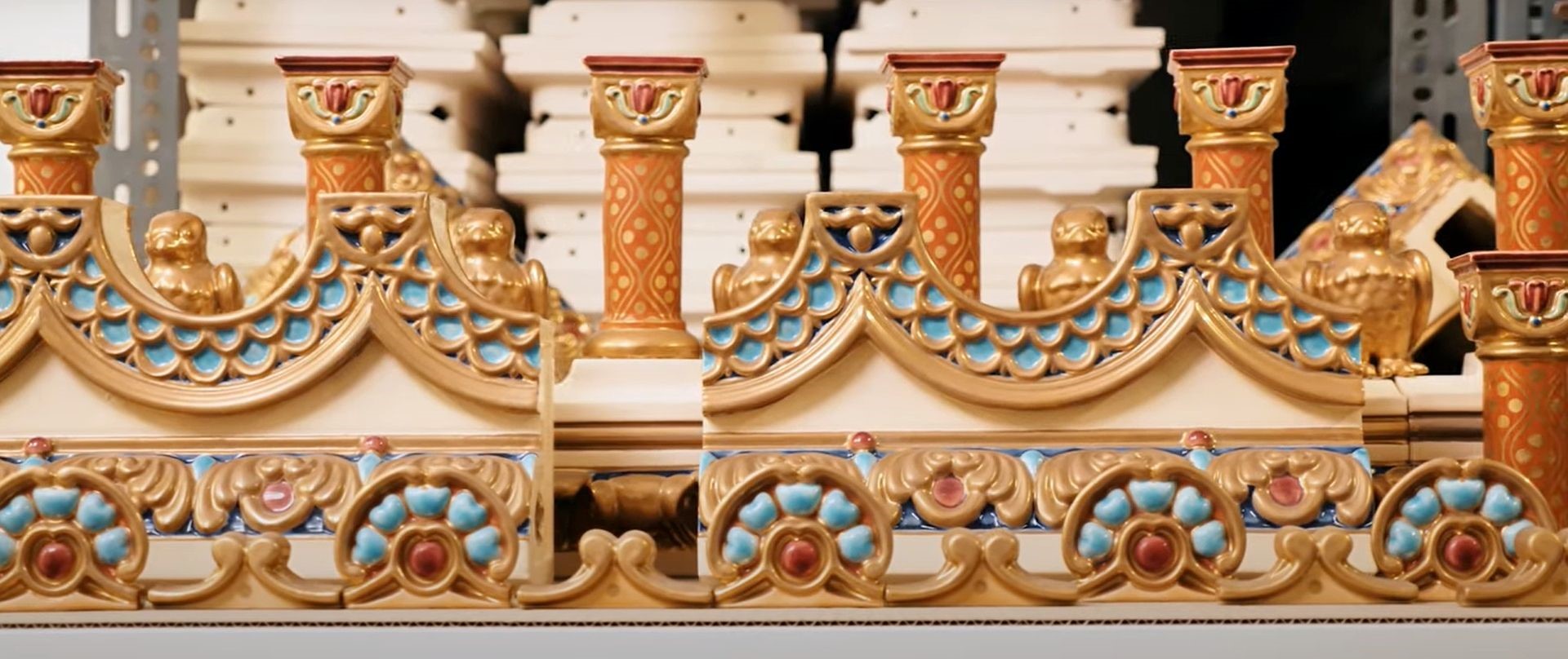 A közelmúltban újraalkotott Zsolnay-kandalló kürtőcsöve a pécsi Zsolnay-gyárban, a próba-összeépítés után (Fotó: Várkapitányság)