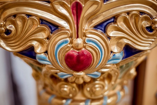 „Ennek a kandallónak minden négyzetcentiméterét újra kellett rajzolnom a fotók alapján. Életnagyságú eredeti terv csak a kandalló töredékéről van, és az sem mindig a ténylegesen megvalósított díszítést és színeket mutatja” – ecseteli a tervezés nehézségeit Angyal Tibor.