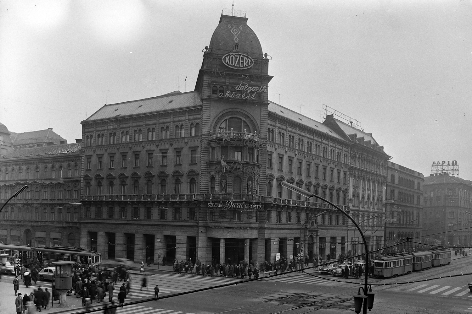 A Blaha Lujza tér sarkán álló Rákóczi út 39. homlokzatát egykor több neonfelirat is díszítette, így a mindenki által jól ismert Közért és a Daru cigaretta logói. A fénykép 1964-ben készült (Fotó: Fortepan/Képszám: 5381)