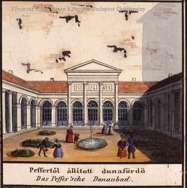 A Pfeffer-féle Dunafürdő – későbbi nevén Diana fürdő – Kirakodó (ma Széchenyi) térre néző részében lakásokat alakítottak ki, ami jól látható ezen az 1837-ben készült képen (Forrás: FSZEK Budapest Gyűjtemény)