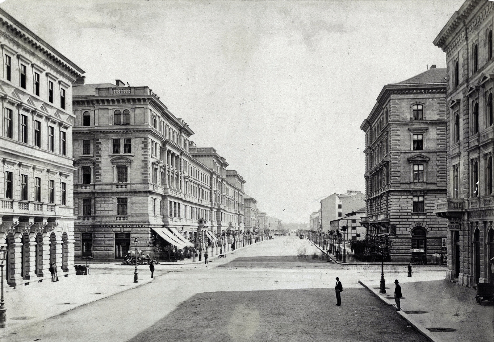 Az elfogadott szabályozási terv lényeges eleme volt a Sugárút, amelyet Lechner Lajos vezetésével kezdtek el kiépíteni. A kép az út 1878-as állapotát ábrázolja (Fotó: Fortepan/Klösz György/Budapest Főváros Levéltára. Levéltári jelzet: HU.BFL.XV.19.d.1.05.107)